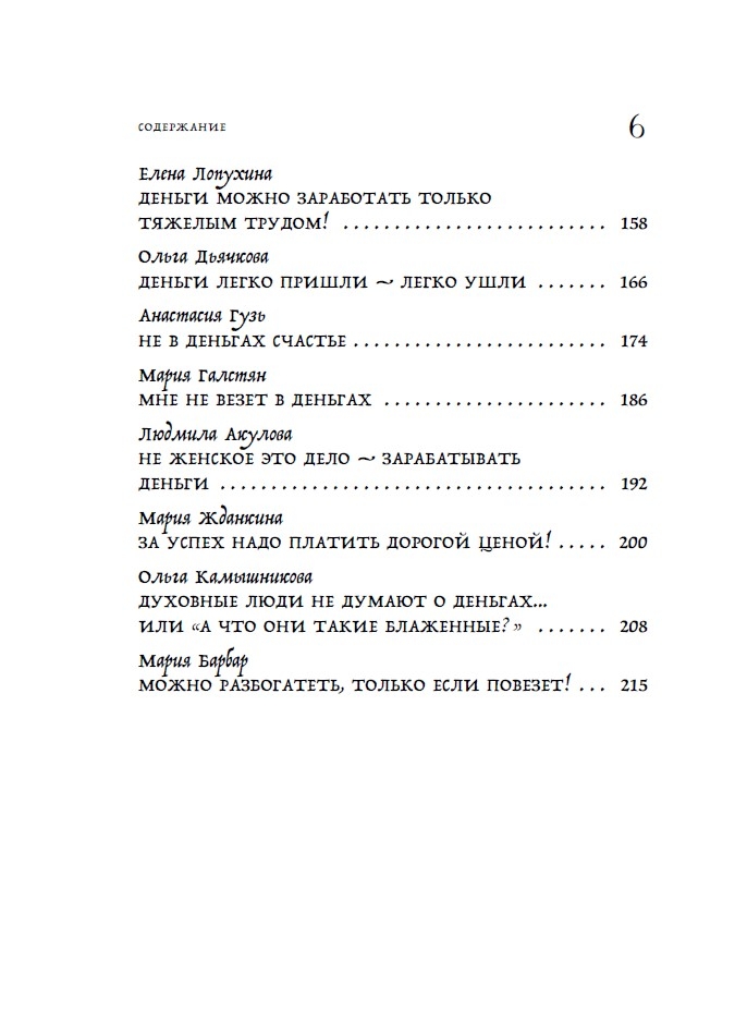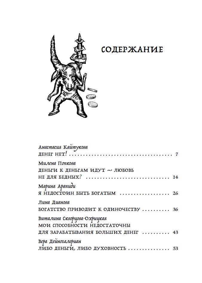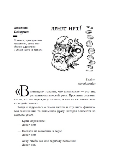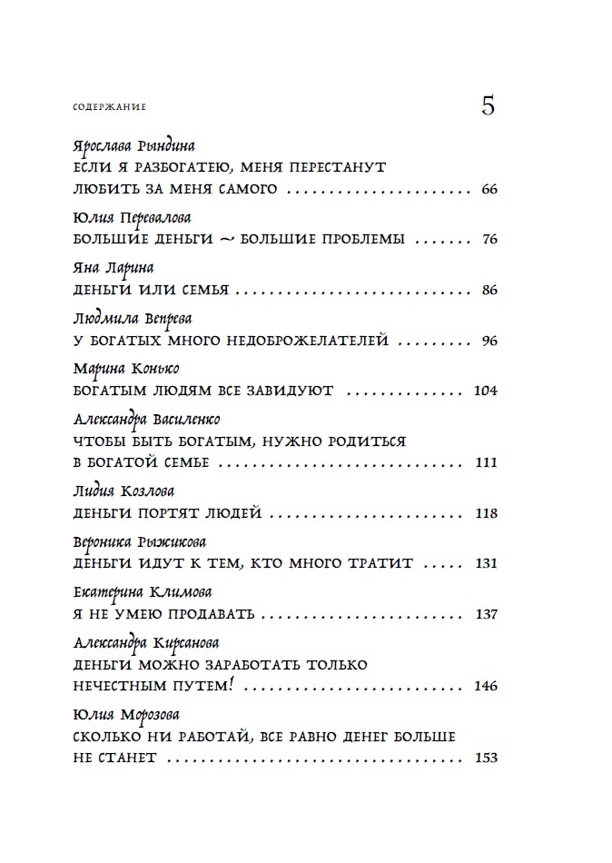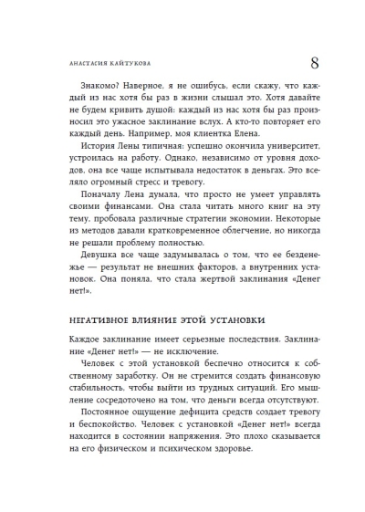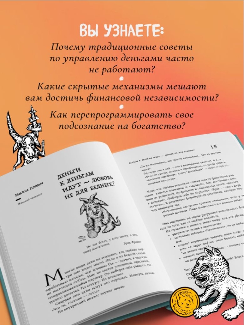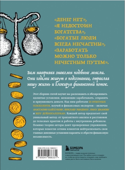 Šī rakstu kolekcija iemācīs jums atpazīt un neitralizēt toksiskus uzskatus, kas neļauj jums nopelnīt, ietaupīt un vairot savu naudu. To izstrādāja 25 pieredzējuši psihologi, kouči un finanšu eksperti, tostarp Anastasija Kaitukova, Jaroslava Rindina, Līna Dianova un Vera Deinogaleriana. Katrs autors piedāvā savu unikālo metodi: sākot no transakciju analīzes un zvaigznājiem līdz ķermeņa darbam un iekšējā bērna darbam. Papildus teorijai autori dalās ar pārbaudītiem vingrinājumiem, kas ir palīdzējuši simtiem klientu neitralizēt savus galvenos ar naudu saistītos uzskatus un sasniegt finansiālu neatkarību.