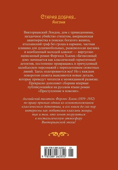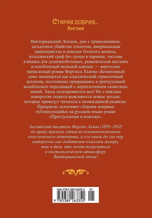 Krājumā iekļauti divi romāni, kuru autors ir Viktorijas laika detektīva tēvs Ferguss Hjūms, dižā Konana Doila priekštecis.
