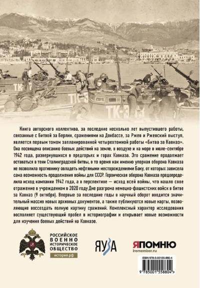 Šī grāmata, ko sarakstījusi autoru komanda, kas pēdējos gados publicējusi darbus par Berlīnes kauju, Donbasa, Rževas kauju un Rževas izcilni, ir pirmais sējums no plānotā četru sējumu darba "Kauja par Kaukāzu". Tajā aprakstītas kaujas operācijas uz sauszemes, gaisā un jūrā no 1942. gada jūlija līdz septembrim, kas risinājās Kaukāza pakājē un kalnos. Šī kauja joprojām ir nozīmīga Staļingradas kaujas ēnā, savukārt tieši spītīgā Kaukāza aizstāvēšana neļāva ienaidniekam ieņemt Baku naftas atradnes, no kurām bija atkarīga pati PSRS kara turpināšanas iespēja. Varonīgā Kaukāza aizstāvēšana noteica 1942. gada kampaņas iznākumu un galu galā visa kara iznākumu, ko atspoguļo 2020. gadā noteiktā nacistu karaspēka sakāves diena Kaukāza kaujā (9. oktobris). Pirmo reizi pēdējos gados zinātniskajā apritē tiek ieviests ievērojams jaunu arhīva dokumentu apjoms, kā arī jaunas kartes, kas ļauj rekonstruēt pilnīgu kauju ainu. Pētījuma visaptverošais raksturs aizpilda esošo robu historiogrāfijā un paver jaunas iespējas militāro operāciju izpētei Kaukāzā.