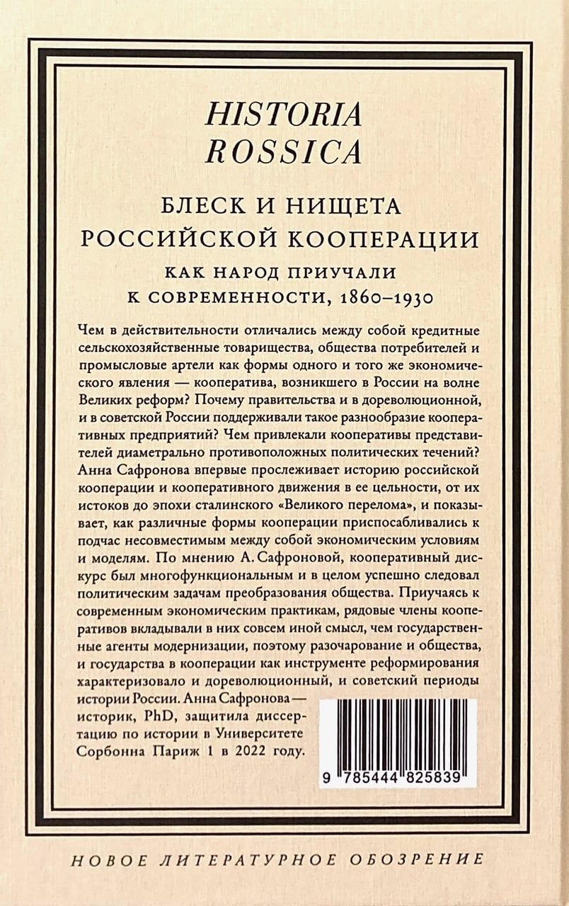 Kas lauksaimniecības kredītu asociācijas, patērētāju biedrības un tirdzniecības artelus patiešām atšķir kā vienas un tās pašas ekonomiskās parādības formas, kooperatīvu, kas radās Krievijā Lielo reformu viļņa laikā? Kāpēc valdības gan pirmsrevolucionārā, gan Padomju Krievijā atbalstīja tik dažādus kooperatīvos uzņēmumus? Kā kooperatīvi piesaistīja diametrāli pretēju politisko strāvojumu pārstāvjus? Anna Safronova pirmo reizi iezīmē Krievijas sadarbības un kooperatīvās kustības vēsturi kopumā, sākot ar to pirmsākumiem un beidzot ar Staļina „Lielo pārmaiņu" laikmetu, un parāda, kā dažādas sadarbības formas pielāgojušās dažkārt nesaderīgiem ekonomiskajiem apstākļiem un modeļiem. Pēc A. Safronova domām kooperatīvais diskurss bija daudzfunkcionāls un kopumā veiksmīgi sekoja sabiedrības pārveides politiskajiem mērķiem. Mācoties mūsdienu ekonomiskajā praksē, parastie kooperatīvu biedri tajos ieguldīja pilnīgi citu nozīmi nekā modernizācijas valsts aģenti, tāpēc gan sabiedrības, gan valsts vilšanās sadarbībā kā reformu instruments raksturoja gan pirmsrevolucionāros, gan padomju laika Krievijas vēsturi.