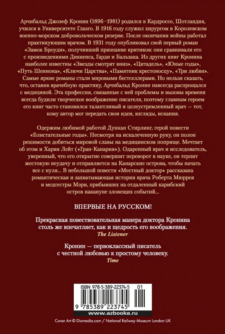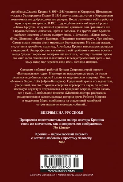 Arčibalds Džozefs Kronins (Archibald Joseph Cronin, 1896-1981) dzimis Skotijā, absolvējis Glāzgovas Universitāti un strādājis par ārstu Dienvidvelsā un Londonā. Taču viņa īstais aicinājums bija literatūra, kurai viņš pievērsās pēc sava pirmā romāna "Brodī pils" skaļiem panākumiem. No citām A. Kronina grāmatām pazīstamākās ir "Zvaigznes lūkojas lejup", "Citadele", "Jaunības gadi", "Šenona ceļš", "Karalistes atslēgas", "Krustnešu piemineklis", "Trīs mīlestības". Spilgtākie romāni pieder pie bestselleru skaita, izklīduši milzīgos tirāžos visā pasaulē, pēc Kronina darbiem izveidoti vairāk nekā 30 ekranizējumi. Taču nevar teikt, ka, pametot ārsta praksi, Arčibalds Kronins uz visiem laikiem atvadījās no medicīnas. Šī profesija, ar to saistītās problēmas un laikmeta izaicinājumi vienmēr modināja rakstnieka radošo iztēli, tāpēc par viņa grāmatu galveno varoni bieži vien kļuva talantīgs un motivēts ārsts - tas, kuram autors varēja nodot savas idejas, uzskatus, meklējumus. Apsēsts ar savu iemīļoto darbu Dankans Stirlings, stāsta "Brilantie gadi" varonis. Neraugoties uz sakropļoto roku, viņš ir apņēmības pilns sasniegt pasaules slavu medicīnas jomā. Par to sapņo arī Hārvijs Leits ("Grankanārija"). Apdāvināts ārsts un pētnieks, pārliecināts, ka viņa atklājums izraisīs revolūciju zinātnē, viņš piedzīvo nežēlīgu neveiksmi un dodas uz Kanāriju salām, lai sāktu visu no nulles ... Īsajā stāstā "Vietējais ārsts" stāstīts romantisks un aizraujošs stāsts par ārstu Robertu Mureju un medmāsu Mēriju, kuri draudīgu notikumu priekšvakarā ierodas nomaļā Karību salā..... Pirmo reizi krievu valodā!