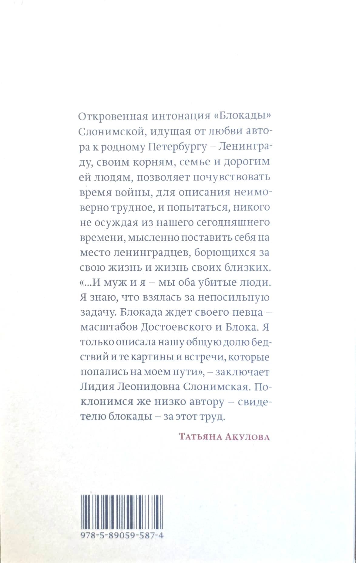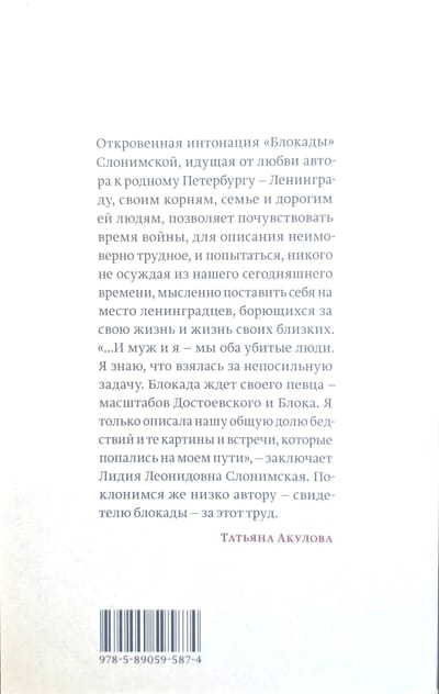 Lidijas Leonidovnas Sloņimskas memuāri par blokādi tika sarakstīti tūlīt pēc kara, balstoties uz dienasgrāmatām un ģimenes saraksti. Tie ir subjektīvi, tāpat kā jebkuras atmiņas, taču to atklātība un reizēm arī nežēlība izriet no mīlestības pret dzimto Pēterburgu — Ļeņingradu —, pret saknēm, ģimeni un tiem, kas viņai dārgi. To intīmais tonis ļauj izjust grūti aprakstāmu kara laiku un mēģināt garīgi iejusties ļeņingradiešu ādā, kas cīnās par savu un savu tuvinieku dzīvībām.