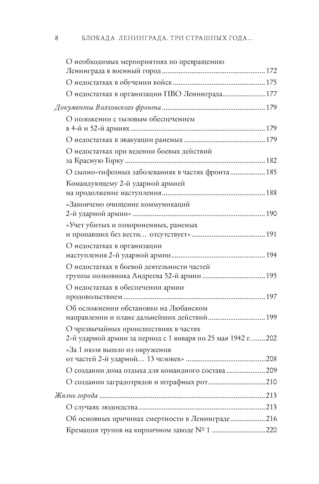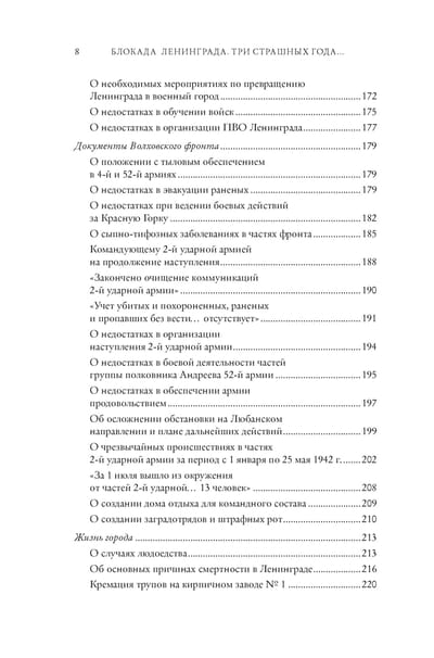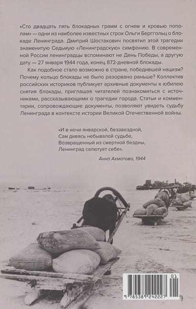 Ko mēs zinām par Ļeņingradas aplenkšanu? Tanjas Savičevas dienasgrāmata, metronoms, Olgas Bergholcas dzejoļi - tās ir spilgtākās asociācijas. Kā šī traģēdija kļuva iespējama un kāpēc tā notika tikai vienā pilsētā četru briesmīgu kara gadu laikā? Šajā grāmatā krievu vēsturnieku komanda pievēršas iepriekš publicētiem arhīvu dokumentiem, soli pa solim rekonstruējot notikumus, kas noveda pie simtiem tūkstošu Ļeņingradas iedzīvotāju bada. Papildinot avotus ar rakstiem un komentāriem, piesaistot jaunāko historiogrāfiju, grāmatas autori parāda, kāpēc padomju vadības plāni apgādāt pilsētu izgāzās un Ļeņingradai nācās 872 dienas pavadīt blokādes aplokā. Vēstures avoti un kartes ļauj izsekot bēdīgi slavenās 2. triecienarmijas, kuru vadīja ģenerālis Vlasovs, liktenim. Pateicoties publicētajiem dokumentiem un fotogrāfijām, lasītāji varēs pieskarties vienai no tumšākajām mūsu valsts vēstures lappusēm un dzirdēt tā laika cilvēku "balsis".