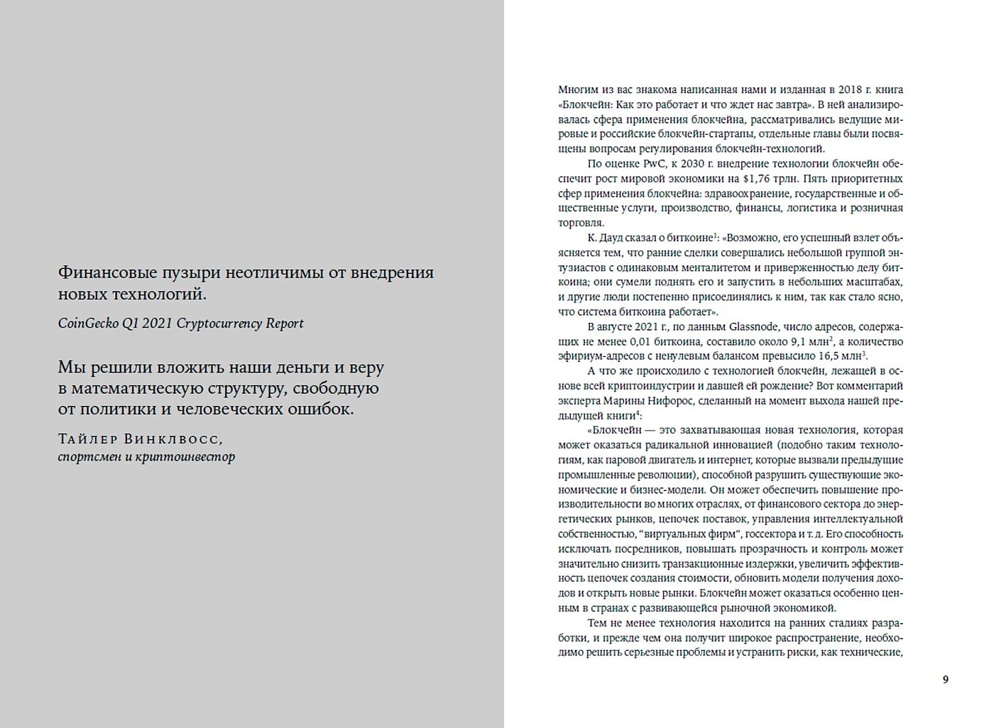 Artema Genkina un Alekseja Mihejeva, ekonomikas zinātņu doktoru, elektroniskās komercijas un investīciju speciālistu, grāmata palīdzēs jums saprast, kas šodien notiek strauji augošajā blokķēdes jomā. Viņi stāsta par blokķēdes izmantošanu dažādās uzņēmējdarbības sfērās, apraksta galvenās kriptovalūtas un DeFi platformas, sniedz NFT un meta-universitātes tirgus attīstības prognozi, kā arī skaidro, kā digitālo aktīvu regulējums tiek noteikts dažādās valstīs.