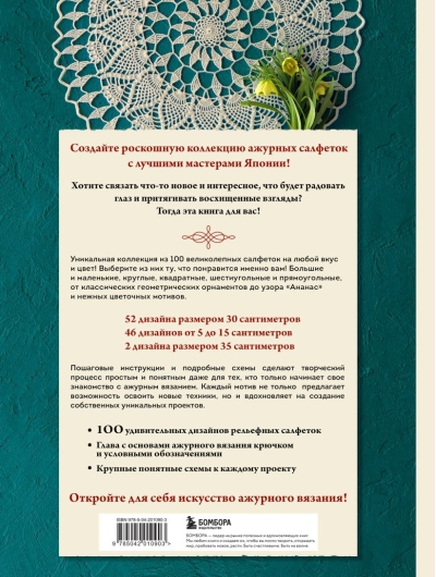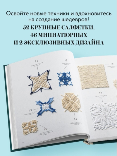 Vai vēlaties uzadīt kaut ko jaunu un aizraujošu, kas priecēs aci un piesaistīs apbrīnas pilnus skatienus? Tad šī grāmata ir domāta jums! Labākie japāņu amatnieki piedāvā unikālu 100 ažūra salvešu kolekciju, kas izdaiļos jūsu mājas vai būs brīnišķīga dāvana. 52 lielas salvetes, 46 miniatūras un 2 ekskluzīvas: lielas un mazas, apaļas, kvadrātveida un sešstūrainas, ar klasiskiem rakstiem, ananāsu dizainu un ziedu motīviem — izvēlieties sev piemērotāko dizainu!