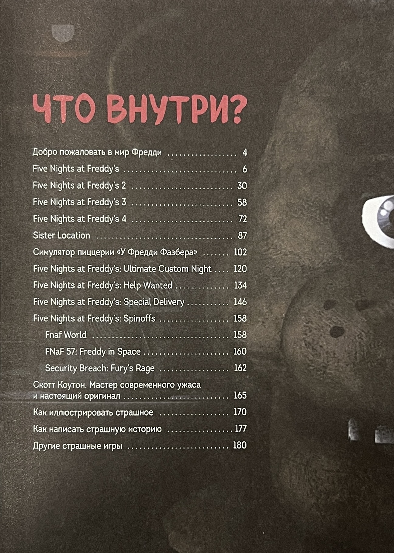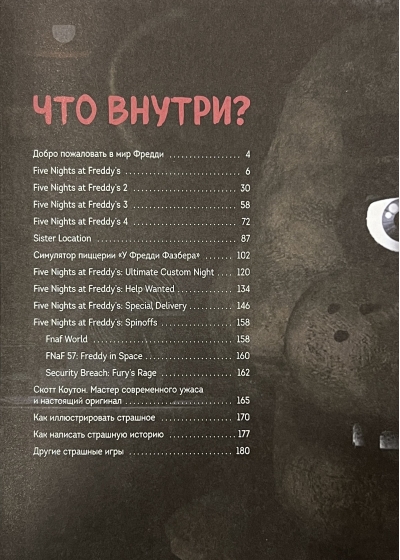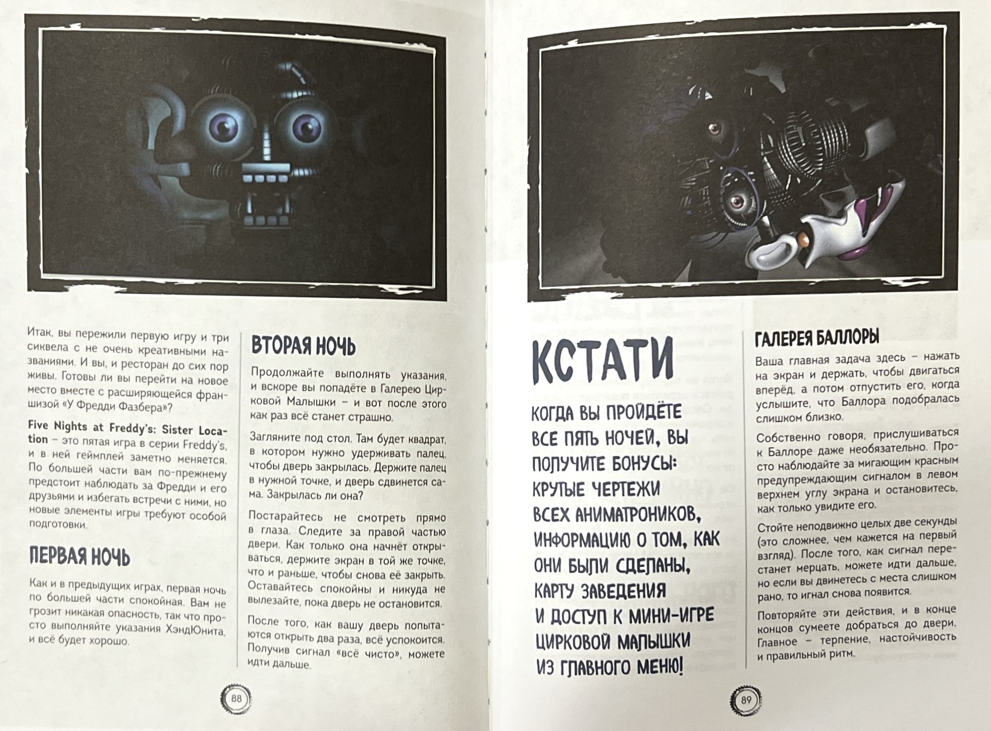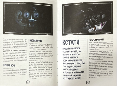 FNAF stila iekšpuse - drūma, daudz melnas krāsas, vietām biedējoša! Šajā grāmatā iekļauts: pastaigu apraksts, animatronikas funkcijas, padomi, kā zīmēt tēlus, kā uzrakstīt savu biedējošo stāstu, šausmu spēļu piemēri, kas varētu interesēt spēlētājus. Ar ko tā atšķiras no citām FNAF rokasgrāmatām: piemērota iesācējam spēlētājam, datorspēļu un animatronikas fanam. Viss detalizēti, vienkāršā valodā, tēli lieli. Lielisks jauns papildinājums Five Nights at Freddy's grāmatu kolekcijai!