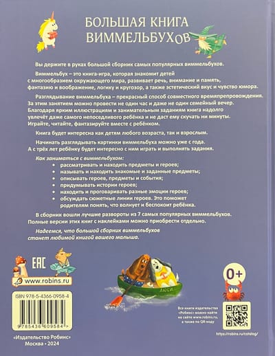 Wimmelbuch ir spēļu grāmata, kas iepazīstina bērnus ar apkārtējās pasaules daudzveidību, attīsta runu, uzmanību un atmiņu, fantāziju un iztēli, loģiku un redzesloku, kā arī estētisko gaumi un humora izjūtu. Wimmelbook aplūkošana ir lielisks veids, kā pavadīt laiku kopā. Jūs varat pavadīt vairāk nekā vienu stundu un pat vairāk nekā vienu ģimenes vakaru.