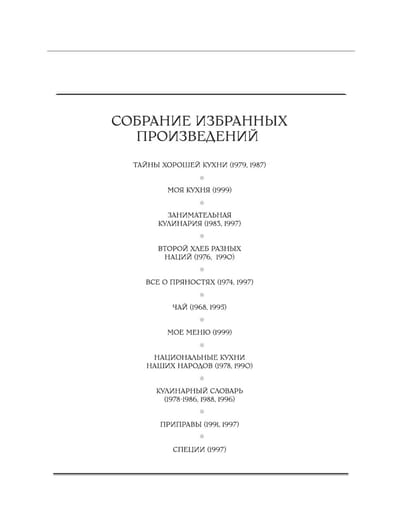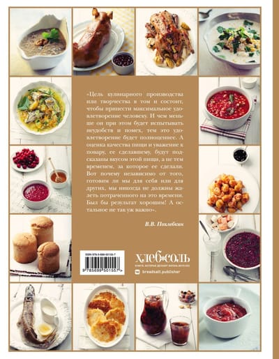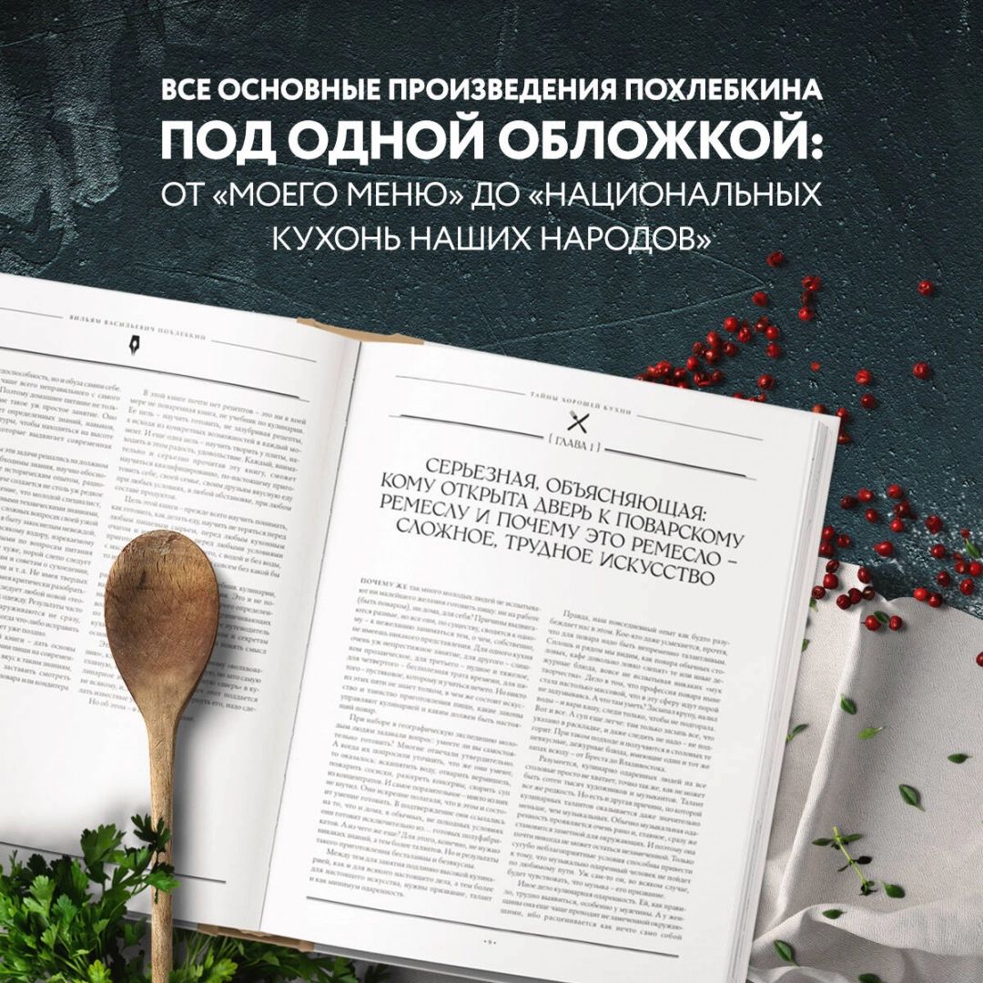 V.V.Pokhlebkin ir unikāls rakstnieks, enciklopēdists, meistars jebkurā jomā, kuru viņš pētīja ar mīlestību, visu mūžu, ar iedvesmu, neatstājot nevienu stūrīti neizpētītu. Izrādās, ka salikt kopā viņa nozīmīgos kulinārijas darbus ir grūti, bet iespējams. Rezultāts ir jūsu rokās. Šeit ir viss, sākot ar "Izklaides pavārmākslu" un beidzot ar "Kulinārijas vārdnīcu". Kulinārijas teorija, prakse, receptes, visu bijušo padomju republiku virtuves, nodaļas par tējām un ēdienu receptes ar garšvielām - īsta kulinārijas veidošanās, izaugsmes un pat profesijas enciklopēdija ikvienam, kas to vēlas. Lietošanas ērtībai ir izveidota unikāla grāmatas meklētājprogramma. Taču īstais palīgs-pastāstnieks šeit ir autors, kurš ar savu literāro talantu jūs ved līdzi un iedvesmo pavisam citādai, nevis smaga darba dzīvei, pie plīts un pie sava skaistā maizes galda.