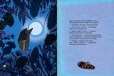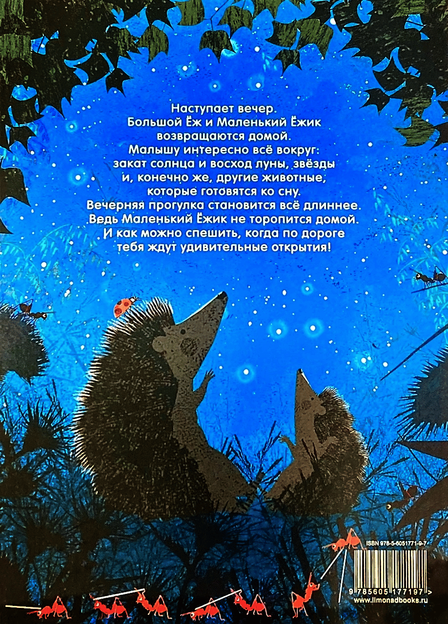Ir vakars. Big Hedgehog un Little Hedgehog atgriežas mājās. Bērnu interesē viss apkārt: saulriets un mēnesskrējiens, zvaigznes un, protams, citi dzīvnieki, kas gatavojas gulēt. Vakara pastaiga kļūst garāka. Mazais Hedgehogs nesteidzas doties mājās. Un kā jūs varat steigties, kad pārsteidzošs atklājumi gaida jūs ceļā!