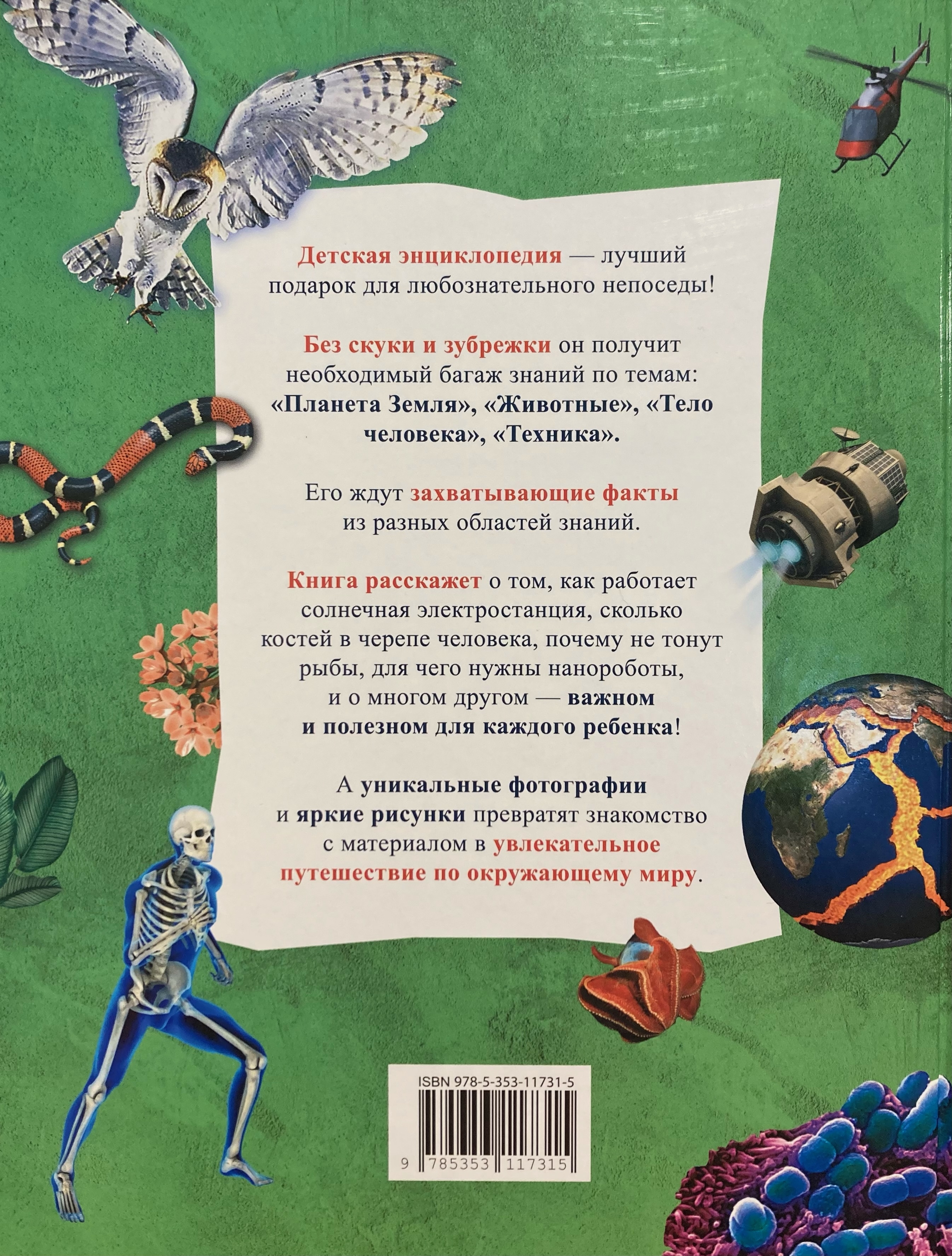 Šī enciklopēdija ir lieliska dāvana zinātkāram bērnam. Kā darbojas saules elektrostacija? Kas dzīvo okeāna dibenā? Cik kaulu ir cilvēka galvaskausā? Kā izskatās indīgās vardes? Vai ir kosmosa lifts, kas jūs nogādās tieši orbītā? Šī grāmata atbildēs uz visiem jūsu jautājumiem, apkopojot vissvarīgākās un noderīgākās zināšanas par mūsu pasauli. Unikālas fotogrāfijas un spilgtas ilustrācijas padarīs lasīšanu par aizraujošu ceļojumu!