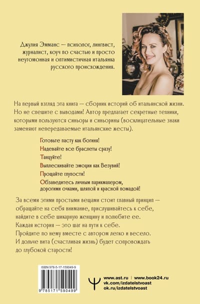 Giulia Emmans ir psiholoģe, lingviste, žurnāliste, laimes trenere un vienkārši nemierīga un optimistiska krievu izcelsmes itāliete. Trīs gadus zaudējusi klīniskajā depresijā, autore atgriezās dzīvē, vērojot tos, kuri savu dzīvi veidojuši ne bez grūtībām, bet vienmēr atraduši prieku mazos priekos. Gandrīz 50 mazie stāsti no dažāda vecuma itālietēm palīdzēs jums ieraudzīt pasauli no cita skatu punkta. Cepures iegāde, briļļu vai velosipēda izvēle vairs nešķitīs naudas izšķiešana, bet gan mīlestības apliecinājums sev. Jūs uzzināsiet, ka garšīgi pagatavota pasta var būt ģimenes laimes pamats, bet neatmaksāta mīlestība - iedvesmas avots. Un, ja aproces, mirdzošas rotaslietas un jauna frizūra rotā jūs no ārpuses, tad iekšpusē spīdēt palīdzēs sapņi, kurus nekad nevajadzētu aizmirst, drosme mainīt savu dzīvi un veselīgs egoisms. Šī grāmata mudina lasītājus vērīgāk paraudzīties uz dzīvi sev apkārt un kļūt nedaudz laimīgākiem.