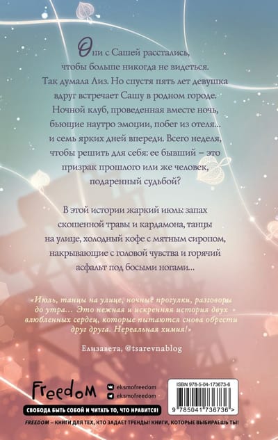 Viņa un Saša izšķīrās un vairs nekad vairs nesatikās. Tā domāja Liza. Taču piecus gadus vēlāk meitene pēkšņi satiek Sašu savā dzimtajā pilsētā. Naktsklubs, kopā pavadīta nakts, uzbrūkošas emocijas no rīta, bēgšana no viesnīcas... un septiņas gaišas dienas priekšā. Tikai nedēļa, lai pati izlemtu svarīgāko dzīves uzdevumu: viņas bijušais ir pagātnes spoks vai likteņa dots cilvēks? Šajā stāstā ir karstais jūlijs: nopļautās zāles un kardamona smarža, dejas uz ielas, auksta kafija ar piparmētru sīrupu, uzplūdušas jūtas un karsts asfalts zem basām kājām.....
