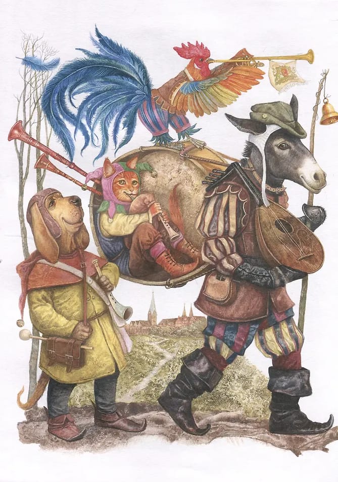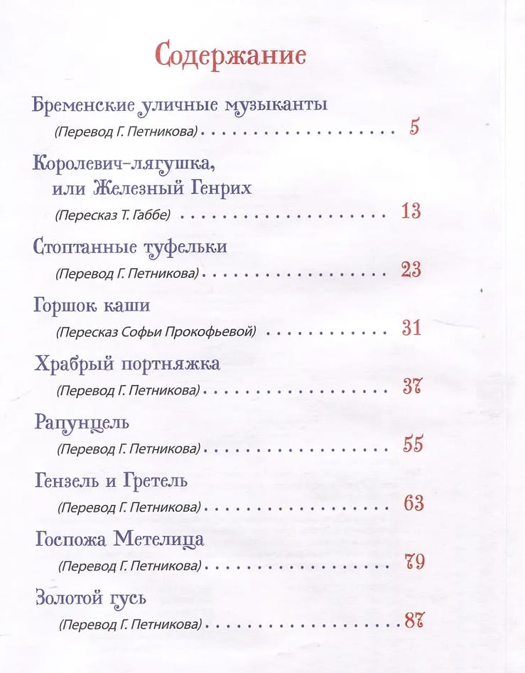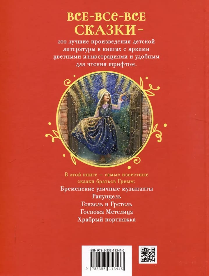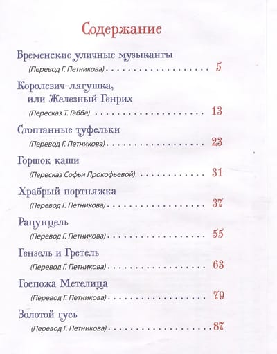 Šajā grāmatā iekļautas slavenākās vācu folkloristu Vilhelma un Jakoba Grimmu apkopotās pasakas: "Brēmenes ielu muzikanti", "Rapuncele", "Ansītis un Grietiņa", "Blizzards kundze" un daudzas citas. Teksti ir iespiesti klasiskos tulkojumos. Ar Vitālija Dudarenko krāsainajām ilustrācijām šī grāmata ir brīnišķīga dāvana jebkuram pasaku mīļotājam.