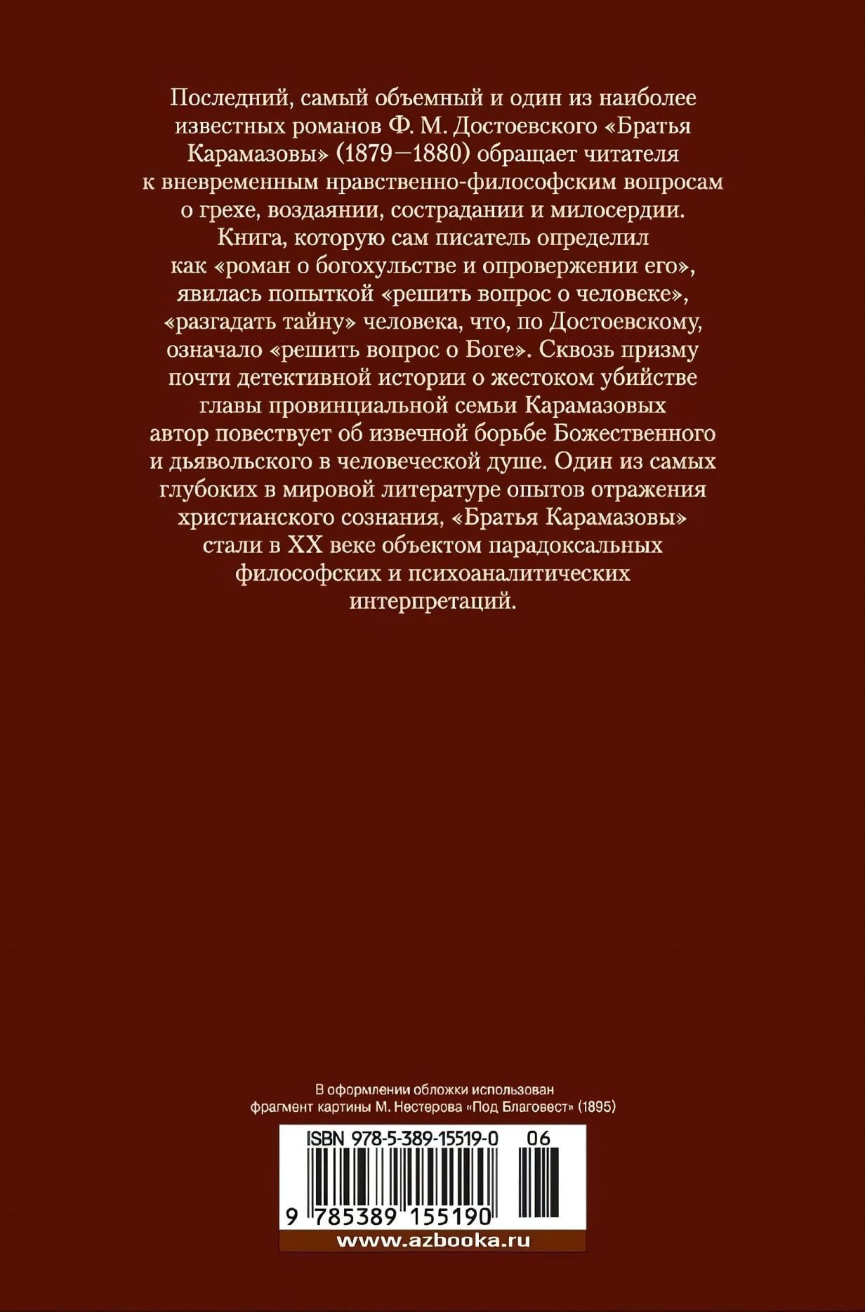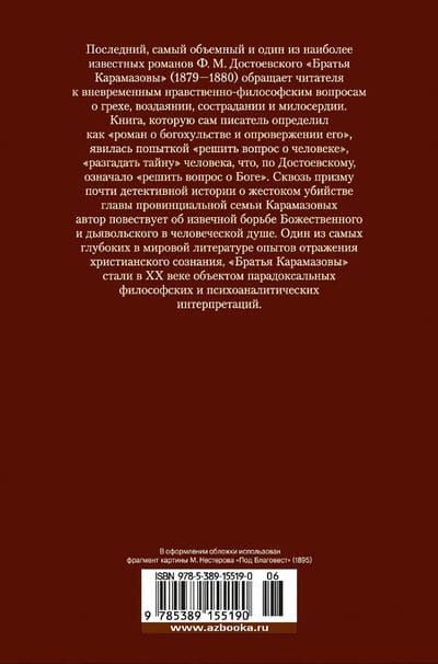"Brāļi Karamazovi" (1879-1880), pēdējais, apjomīgākais un viens no slavenākajiem F. M. Dostojevska romāniem, pievērš lasītāju mūžīgiem morāles un filozofijas jautājumiem par grēku, sodu, līdzcietību un žēlsirdību. Grāmata, kuru pats rakstnieks definēja kā "romānu par zaimošanu un tās atspēkošanu", bija mēģinājums "atrisināt cilvēka jautājumu", "atšķetināt cilvēka noslēpumu", kas, pēc Dostojevska domām, nozīmēja "atrisināt Dieva jautājumu". Caur gandrīz vai detektīvstāsta prizmu par provinciālās Karamazovu dzimtas galvas brutālo slepkavību autors stāsta par mūžīgo cīņu starp Dievišķo un Velnu cilvēka dvēselē. Viens no dziļākajiem kristīgās apziņas atspoguļojumiem pasaules literatūrā "Brāļi Karamazovi" kļuva par paradoksālu filozofisku un psihoanalītisku interpretāciju objektu 20. gadsimtā.