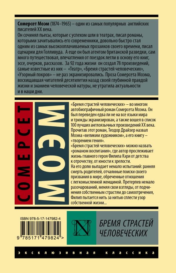 Somerseta Mogema (Somerset Maugham) romāns "Cilvēka kaislību nasta" ir lielā mērā autobiogrāfisks romāns. Tas ir tulkots gandrīz visās pasaules valodās un ekranizēts trīs reizes, kā arī iekļauts XX gadsimta 100 labāko darbu sarakstā angļu valodā. Pēc šī romāna izlasīšanas Teodors Dreisers nosauca Mūgu par "izcilu mākslinieku", bet viņa grāmatu - par "ģeniālu darbu". "Cilvēka kaislību nastu" var dēvēt par "audzināšanas romānu", kurā autors izseko galvenā varoņa Filipa Kerija dzīves gaitām no bērnības līdz pusaudža gadiem, no jaunības līdz briedumam. Uz viņa pleciem gulstas daudz pārbaudījumu: agrīna vecāku nāve, izmisīgi sava aicinājuma meklējumi pasaulē, liktenīgas attiecības ar vieglprātīgu sievieti. Piedzīvojis daudzas vilšanās, mainījis uzskatus, no pakļaušanās savām kaislībām līdz pašaizliedzībai, Filips mēģina diegu pēc diega aust savas dzīves modeli.....