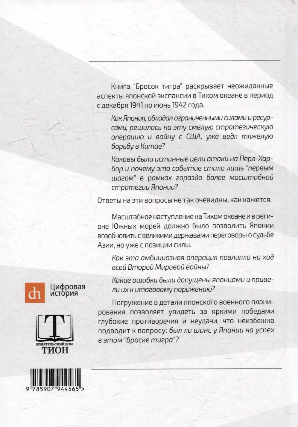 Grāmata "Tīģera lēciens" atklāj negaidītus Japānas ekspansijas aspektus Klusajā okeānā no 1941. gada decembra līdz 1942. gada jūnijam. Kā Japāna ar ierobežotiem spēkiem un resursiem nolēma uzsākt drosmīgu stratēģisku operāciju, kas Amerikas Savienotajām Valstīm un tās sabiedrotajiem sāktu Otro pasaules karu? Kādi bija Pērlhārboras uzbrukuma patiesie mērķi un kāpēc šis notikums bija tikai "pirmais solis" daudz plašākā Japānas stratēģijā? Atbildes uz šiem jautājumiem nav tik acīmredzamas, kā šķiet.