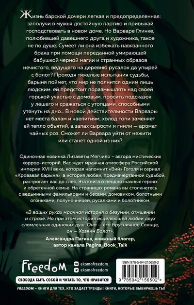 Muļķnieces meitas dzīve ir viegla un iepriekš noteikta: atrast cienīgu vīru un pierast pie jaunās mājsaimniecības pārvaldīšanas. Taču Varvara Gļinka, kura ir iemīlējusies savā ilggadējā draudzenē un māksliniekā, to nedara. Vai viņai izdosies izbēgt no šīs piespiedu laulības ar melnās maģijas palīdzību, ko mantojusi viņas mirstošā vecmāmiņa, un dīvainajiem ļaunā gara tēliem, kas no purviem uz ciematu atved nāras un spokus? Pārvarot likteņa grūtos pārbaudījumus, dāma sapratīs, ka pasaule nav piepildīta tikai ar cilvēkiem: viņai būs jāpārdomā savs rūgtais liktenis ar brauniju, jāprasa pavedieni meža goblinam un jācīnās ar slīcējiem, kas varētu viņu novilkt dzelmē... Varvaras jaunajā realitātē nav vietas ballēm un tējas ballītēm; purva aukstums nomaina apskāvienu siltumu, un mitruma un puves smaka nomaina tējas rožu smaržu. Vai Varvara spēs izbēgt no nemirstīgajiem, vai arī viņa kļūs par vienu no viņiem?