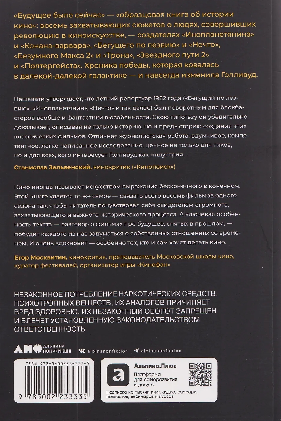 Kriss Našavatijs apraksta pavērsiena punktu Holivudas un pasaules kino vēsturē: mežonīgo 1982. gada vasaru, kuras laikā īsā laikā tika izlaistas astoņas kulta klasikas zinātniskās fantastikas filmas: "E.T." un "Konans barbars", "Pa asmeni skrējējs un lieta", "Trakais Makss 2" un "Trons", "Zvaigžņu ceļš 2" un "Poltergeists". Dažas bija absolūti grāvēji, citas cieta neveiksmi kinoteātros, tomēr visas galu galā ieguva nozīmīgu vietu kino vēsturē. "Nākotne bija tagad" ir "noteicošā grāmata par filmu vēsturi": astoņi aizraujoši stāsti par šo filmu veidotājiem, vīriešiem, kas veica revolūciju kino. Hronika par uzvaru, kas kaldināta tālā, tālā galaktikā, kas uz visiem laikiem mainīja Holivudu.