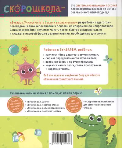 Primer. "Neiro pieeja lasīšanas mācīšanai" ir rokasgrāmata, kas izstrādāta, izmantojot logopēdes Jeļenas Molčanovas efektīvo metodiku. Ar tās palīdzību bērns ne tikai apgūs burtus, bet arī iemācīsies tekoši un skaidri lasīt, pareizi liekot semantisko stresu. Turklāt interaktīvie uzdevumi viņam iemācīs atšķirt skaņas, kas izklausās līdzīgi, nejaukt līdzīgas vārdu formas, kas liks pamatu rakstpratīgai rakstīšanai Zvaigznes ikona norāda uz tekstu, ko bērns lasa.
