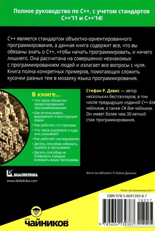 Mācies programmēt! Pilnīgs C++ ceļvedis ar C++ un C++ 14. Vai vienmēr esat vēlējies iemācīties programmēt, bet nezinājāt, kuru valodu izvēlēties un ar ko sākt? Lūk, atbilde uz visiem jūsu neizrunātajiem jautājumiem - sāciet programmēt vienā no spēcīgākajām programmēšanas valodām, C++, un sāciet, iegādājoties grāmatu C++ for Dummies, kurā vienkāršā un viegli saprotamā valodā izskaidroti visi C++ programmēšanas pamati, un, kas ir ļoti svarīgi, izklāsta precizitāte un stingrība nav upurēta skaidrības un saprotamības labā. Vai jūs baidāties, ka jums nav pietiekamu pamatzināšanu? Ja jūs protat ieslēgt datoru un nesajaucat peli un tastatūru, jūs tiksiet galā ar šo grāmatu, kas izdota jau septītajā izdevumā (tātad satur informāciju par visiem C++ jaunumiem) un daudziem lasītājiem ir devusi biļeti uz aizraujošo programmēšanas pasauli. C++ ir objektorientētās programmēšanas standarts, un šajā grāmatā ir viss, kas jums jāzina par C++, lai sāktu programmēt, un nekā par daudz. Tā ir domāta cilvēkiem, kuriem programmēšana ir pilnīgi sveša, un tajā viss izklāstīts no pašiem pamatiem. Grāmatā ir daudz konkrētu piemēru, kas palīdz salikt kopā dažādu tēmu gabaliņus programmēšanas valodas mozaīkā.
