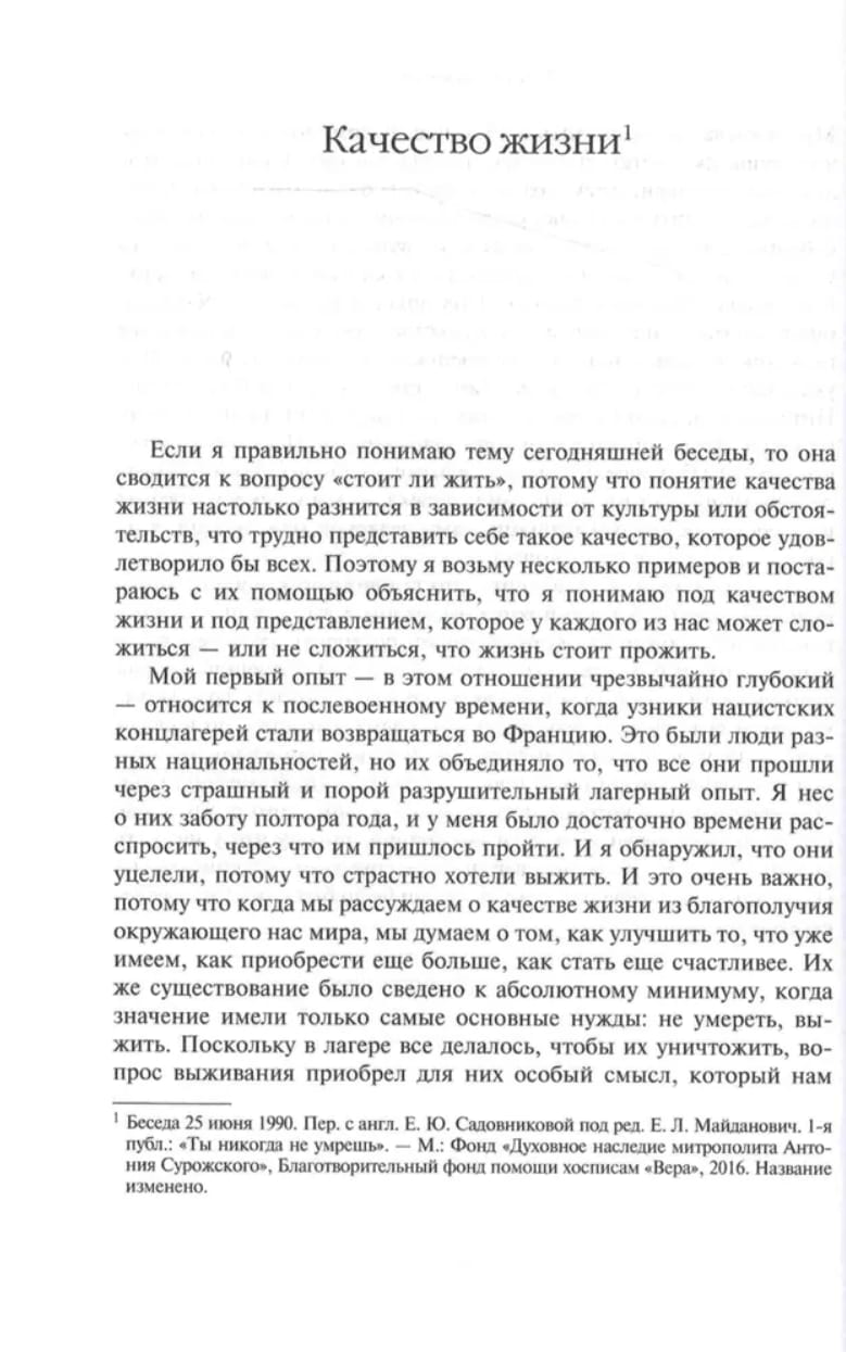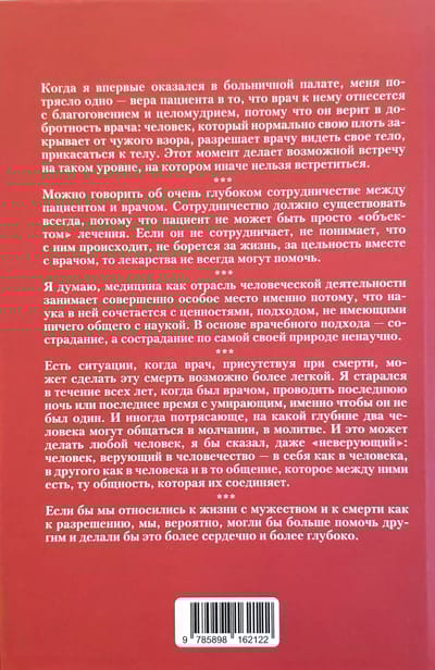 Surožas metropolīts Antonijs, viens no cienījamākajiem kristiešu mācītājiem un autoritatīvākajiem 20. gadsimta domātājiem un teologiem, pēc izglītības bija ārsts. Vairāk nekā pusgadsimta ilgajā pastorālajā darbā metropolīts Antonijs nepārtraukti pārdomāja medicīnas tēmas. Šī grāmata ir apkopota no dažādu gadu lekcijām, sarunām un sprediķiem, kas veltīti medicīnas jautājumiem. Metropolīta Antonija vārdi ir aktuāli, spilgti un saistoši, un tie uzrunā katru cilvēku personīgi. Grāmata ir sadalīta piecās daļās. Vispirms metropolīts Antonijs iepazīstina ar savu personīgo pieredzi, tad ar savām zinātniskajām zināšanām, medicīnisko un psiholoģisko pieredzi un visbeidzot ar saviem kristīgajiem uzskatiem. Šī grāmata ir paredzēta visu specialitāšu ārstiem, medicīnas studentiem un plašai sabiedrībai neatkarīgi no reliģiskās piederības.
