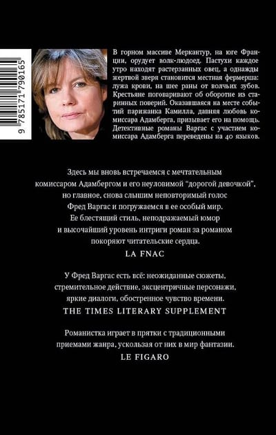 "Vīrs ar iekšpusi uz āru" ir izcilā Freda Vargasa otrais romāns, kurā galveno lomu atveido leģendārais inspektors Adamsbergs. Šoreiz aizraujošais sižets risinās kalnos, kur joprojām dzīvo senas leģendas un māņticības. Alpu ganībās katru dienu tiek atrastas aitas, kas acīmredzot ir neredzama milzu vilka medījums. Drīz vien vietējā zemnieka upuris izrādās sieviete: uz kakla plēstas brūces, asins peļķe un vilka zobu pēdas. Zemnieki sāk runāt par vilkaci — puscilvēku, pusvilku no senām leģendām. Trīs cilvēki dodas medīt zvēru cilvēka veidolā: mirušās sievietes adoptētais dēls, vecs gans un parīziete Kamils Forestjē, inspektora Adamsberga mūžīgi nenotveramā mīlestība. Taču inspektors netic vilkačiem; viņš veic izmeklēšanu, izmantojot tikai viņam zināmas metodes. Romāns kalpoja par pamatu televīzijas filmai un ieguva trīs literārās balvas. Freda Vargasa grāmatas par komisāru Adamsbergu ir tulkotas četrdesmit valodās un saņēmušas daudzas nacionālas un starptautiskas balvas, tostarp trīs britu Duncan Laurie Daggers balvas un Astūrijas princeses balvu, kas pazīstama kā "Spānijas Nobela prēmija".