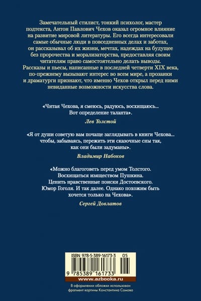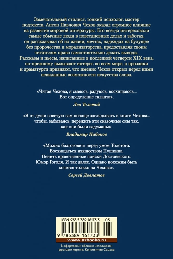 Izcils stilists, smalks psihologs, zemteksta meistars - Antonam Pavlovičam Čehovam bija milzīga ietekme uz pasaules literatūras attīstību. Viņu vienmēr interesēja visparastākie cilvēki savās ikdienas lietās un rūpēs, viņš stāstīja par viņu dzīvi, sapņiem, nākotnes cerībām bez pareģojumiem un moralizēšanas, dodot lasītājiem tiesības pašiem izdarīt secinājumus. Stāsti un lugas, kas sarakstītas 19. gadsimta pēdējā ceturksnī, joprojām izraisa interesi visā pasaulē, un prozaiķi un dramaturgi atzīst, ka tieši Čehovs viņiem pavēra vēl nebijušas vārda mākslas iespējas.
