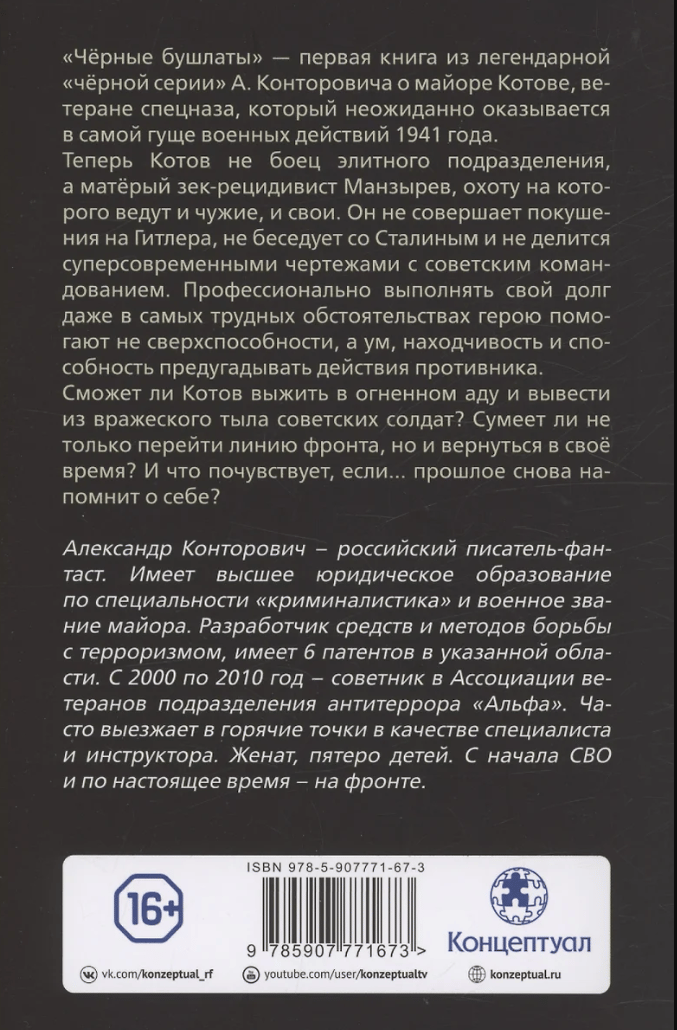 "Melnie zirņu mēteļi" ir pirmā grāmata leģendārajā A.Kontoroviča "melnajā sērijā" par majoru Kotovu, specvienības veterānu, kurš 1941.gadā negaidīti attopas laikā nogādāts pašā militārās darbības biezumā. Šī grāmata ir par ceļotāju laikā, kura liktenis krasi mainās: tagad Kotovs ir nevis elites vienības cīnītājs, bet gan rūdīts recidīvists notiesātais Manzirevs, kuru medī gan svešinieki, gan savējie. Viņš nemēģina noslepkavot Hitleru, nerunā ar Staļinu un nedalās ar padomju pavēlniecību jaunākajos projektos. Ne jau lielvaras palīdz varonim profesionāli veikt savu pienākumu pat vissarežģītākajos apstākļos, bet gan inteliģence, attapība un spēja paredzēt ienaidnieka rīcību. Vai Kotovs spēs pārdzīvot ugunīgo elli un izvest padomju karavīrus no ienaidnieka aizmugures? Vai viņš spēs ne tikai šķērsot frontes līniju, bet arī atgriezties savā laikā? Un ko viņš jutīs, ja... pagātne atkal par sevi atgādinās?