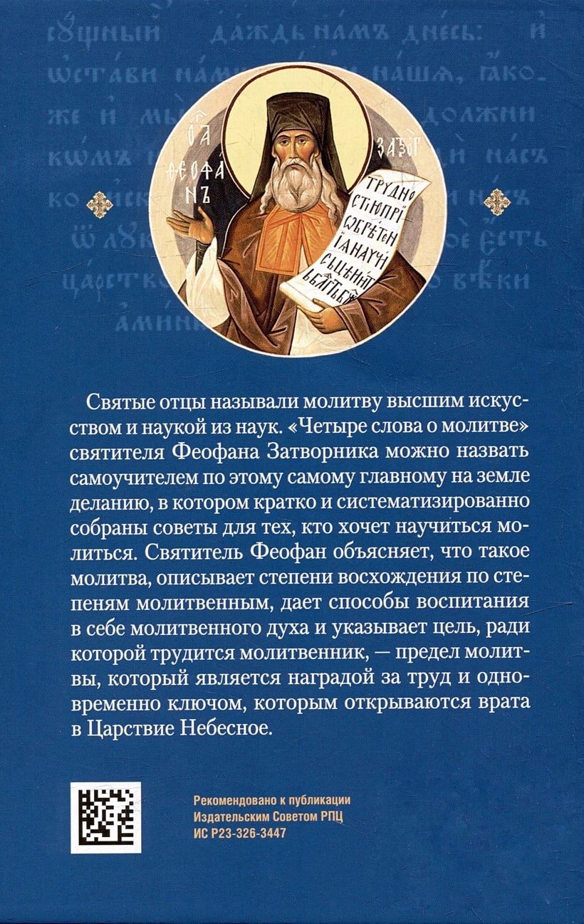 Svētie tēvi sauca lūgšanu par augstāko zinātņu mākslu un zinātni. Svētā Teofana Pustulnieka "Četri vārdi par lūgšanu" var saukt par pašmācības grāmatu par šo svarīgāko darbu uz zemes, kurā īsi un sistemātiski apkopoti padomi tiem, kas vēlas iemācīties lūgt. Svētais Teofans skaidro, kas ir lūgšana, apraksta pacelšanās pa lūgšanas pakāpēm, sniedz veidus, kā sevī izkopt lūgšanu garu, un norāda mērķi, kura dēļ lūdzējs strādā, — lūgšanas robežu, kas ir atlīdzība par ieguldīto darbu un vienlaikus atslēga, ar kuru atveras vārti uz Debesu valstību.