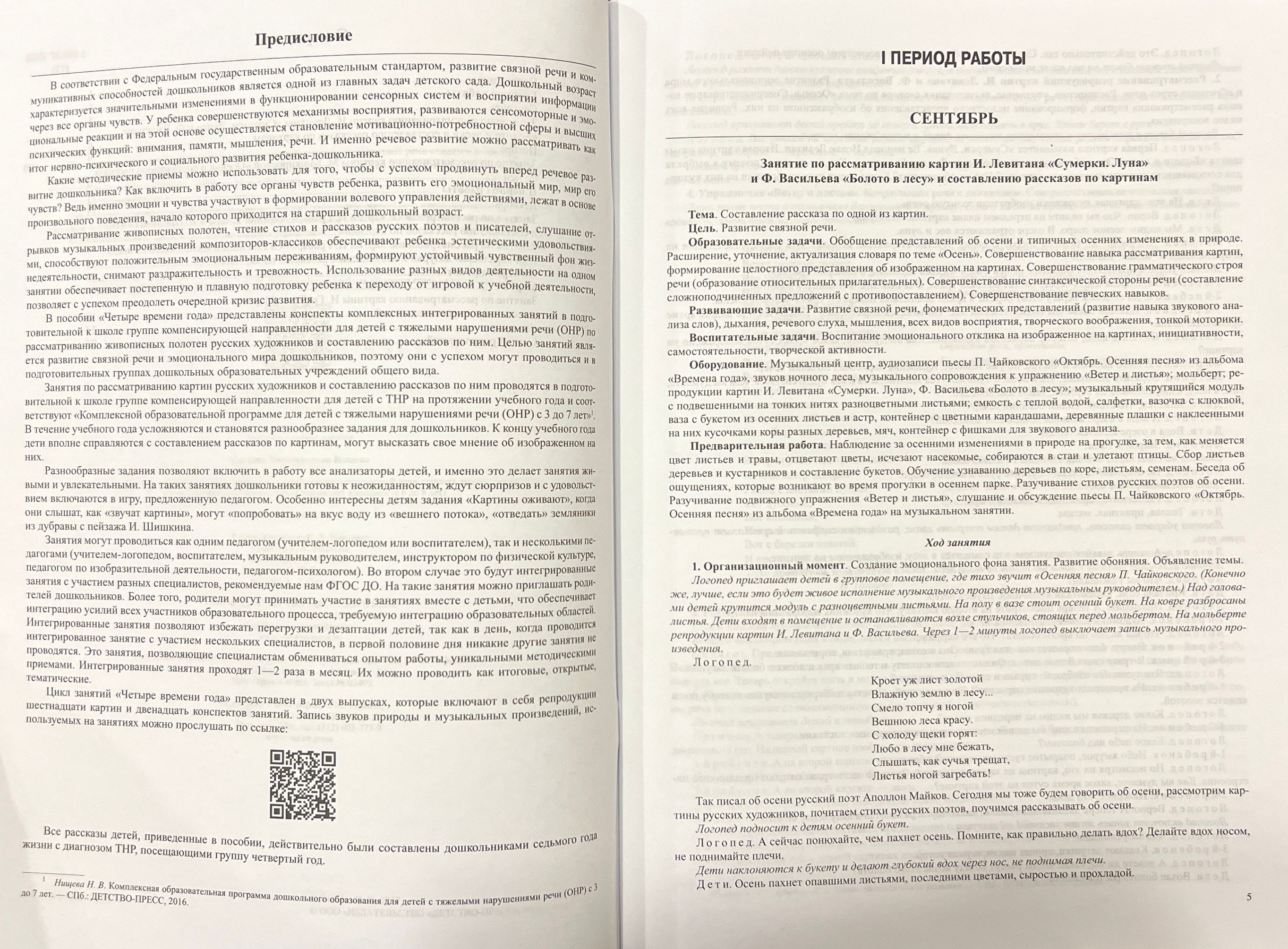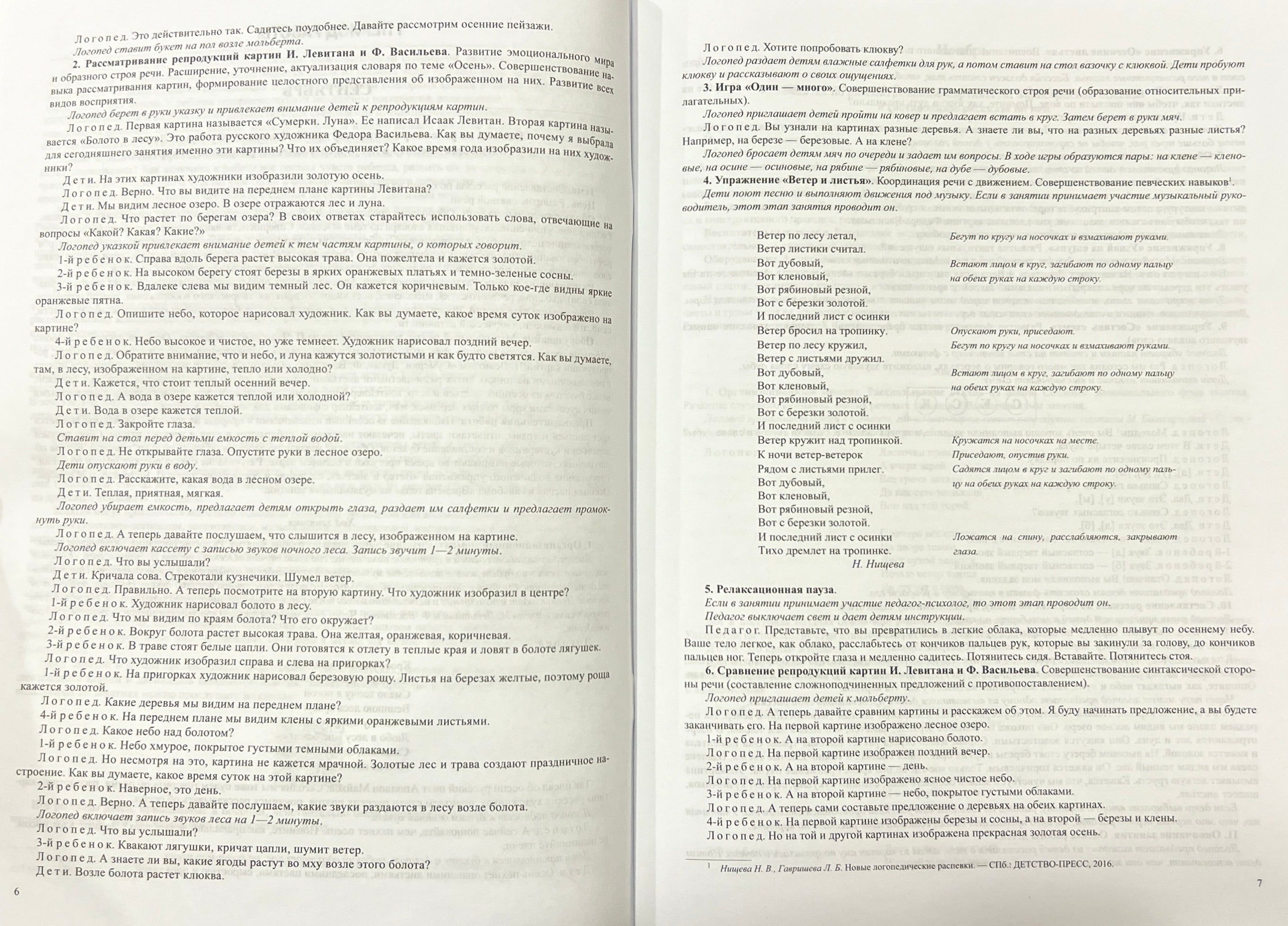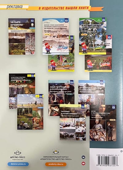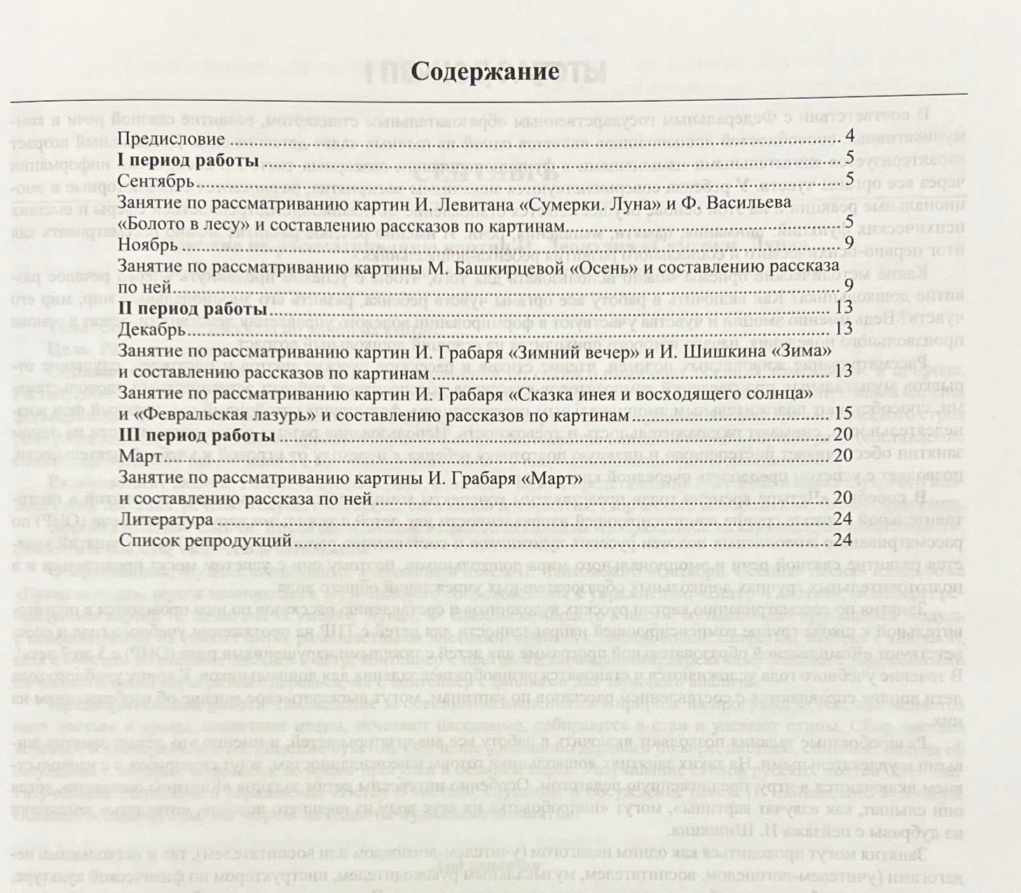Publikācijā izklāstītas tādas inovatīvas izglītojošas darbības formas kā integrētas nodarbības ar dažādu speciālistu līdzdalību par pirmsskolas vecuma bērnu sakarīgas runas attīstību, aplūkojot ainavu glezniecības darbus. Rokasgrāmatā iekļauta krāsainu reprodukciju izlase ar slavenu krievu mākslinieku darbiem.
