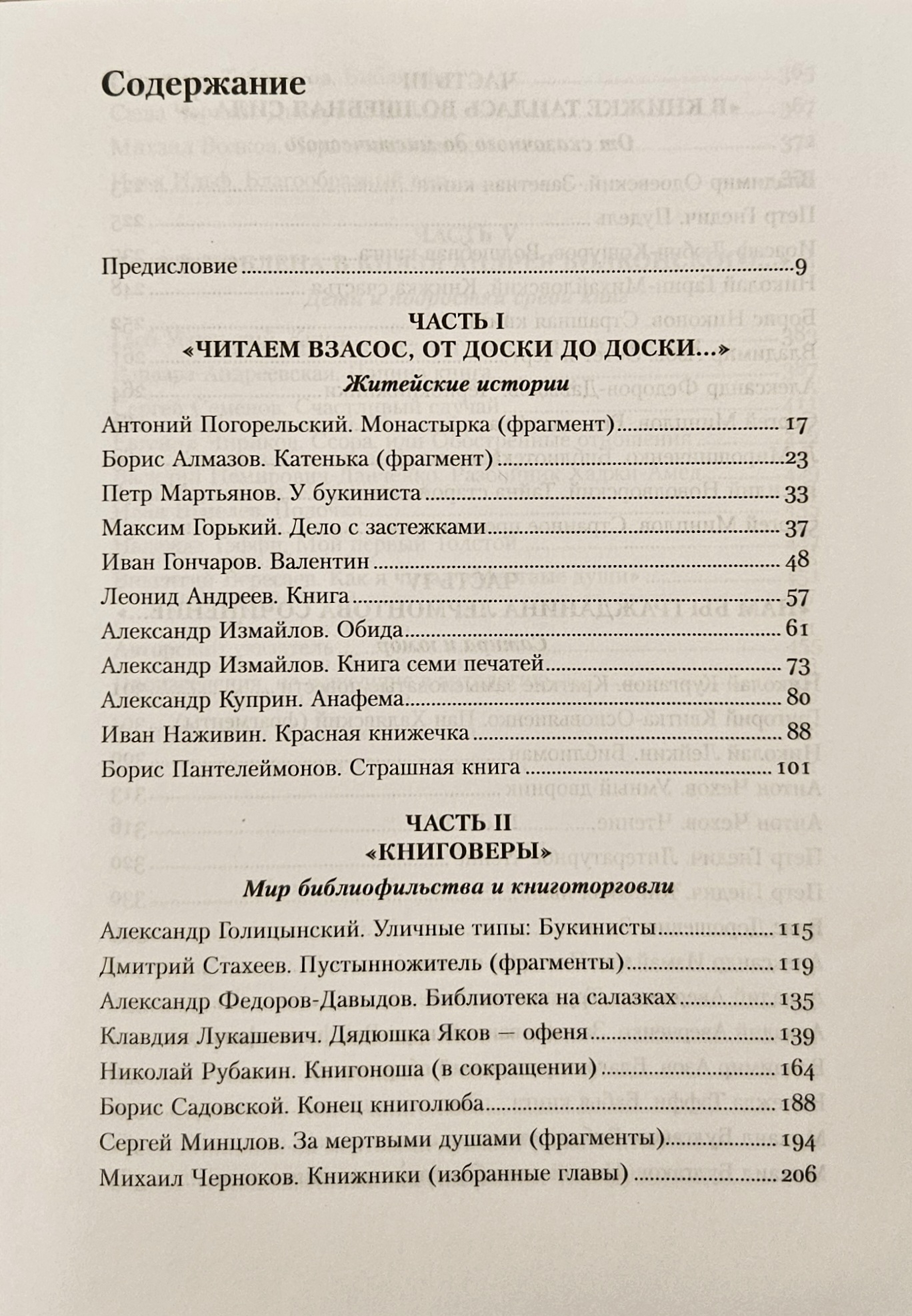 Šī grāmata ir aizraujošs ceļojums krievu literatūras pasaulē, kur galvenais varonis ir pati grāmata. Jūlija Ščerbinina antoloģijā apkopoja dažādus stāstus: no reālistiskām skicēm līdz mistiskiem romāniem, no satīriskām ainām līdz aizkustinošām bērnības atmiņām. Piecas antoloģijas nodaļas stāstīs par grāmatas lomu dažādu sabiedrības segmentu dzīvē, par to, kā darbojusies grāmatu tirdzniecība, kur par retām publikācijām tika maksātas bagātības un kādas leģendas grāmatām deva mistisku flair. Antoloģija iepazīstina gan ar pazīstamiem XIX-XX gadsimtu krievu autoriem (I. Gončarovu, A. Čehovu, A. Kuprinu, M. Gorkiju), gan ar pusaizmirstu, kura darbi arī ir pilni šarma.