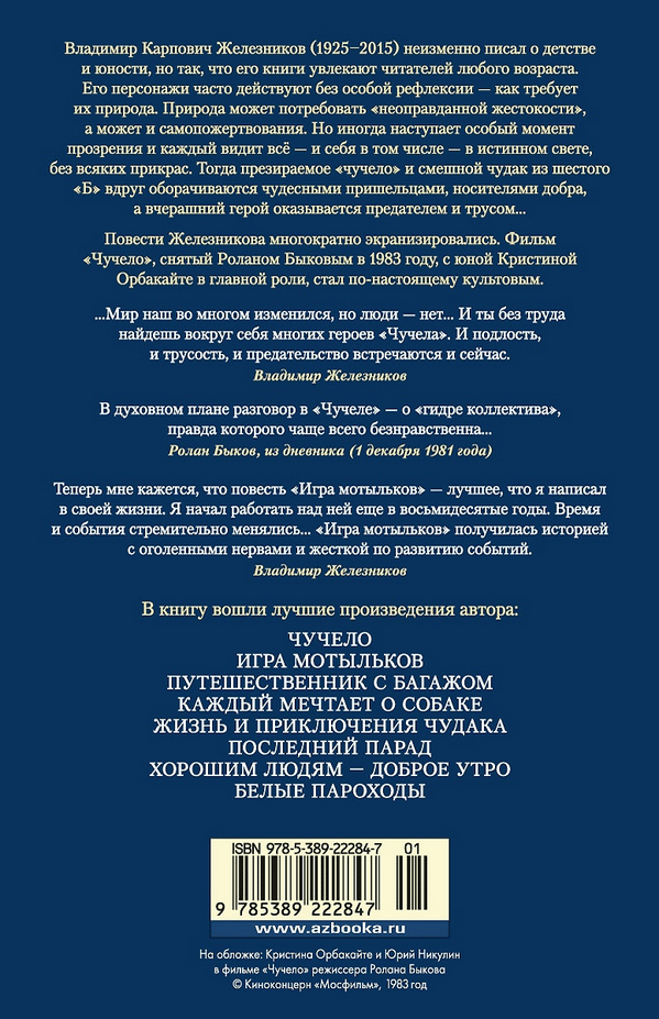 Vladimirs Karpovičs Žeļezņikovs (1925-2015) nemainīgi rakstīja par bērnību un jaunību, taču tā, lai viņa grāmatas aizrautu visu vecumu lasītājus. Viņa varoņi bieži rīkojas bez ilgām pārdomām - tā, kā to prasa viņu daba. Daba var prasīt "neattaisnojamu nežēlību" vai pašaizliedzību. Taču reizēm ir kāds īpašs epifānijas brīdis, un katrs visu - un arī sevi - ierauga patiesajā gaismā, pārsteidzoši skaidri, bez jebkādiem piedevām. Tad nicinātais "biedēklis" un smieklīgais dīvainītis no sestās "B" pēkšņi pārvēršas par brīnišķīgiem citplanētiešiem, labā nesējiem, un vakardienas varonis izrādās nodevējs un gļēvulis... Stāsti Žeļezņikovs daudzkārt ekranizēti. Par patiesi kulta filmu ir kļuvusi Rolana Bykova 1983. gadā uzņemtā filma "Slepkava" ar jauno Kristīnu Orbakaiti galvenajā lomā.
