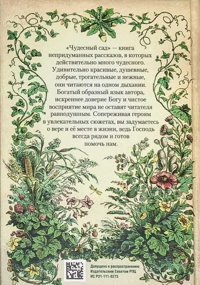 "Brīnišķīgais dārzs" ir patiesu stāstu grāmata, kurā patiešām ir daudz brīnišķīgu lietu. Apbrīnojami skaisti, dvēseliski, laipni, aizkustinoši un maigi, tie tiek lasīti vienā elpas vilcienā. Autora bagātīgā tēlainā valoda, patiesā paļaušanās uz Dievu un tīrā pasaules uztvere neatstās lasītāju vienaldzīgu. Jūtot līdzi aizraujošu stāstu varoņiem, jūs domāsiet par ticību un tās vietu dzīvē, jo Tas Kungs vienmēr ir tuvu un gatavs mums palīdzēt.
