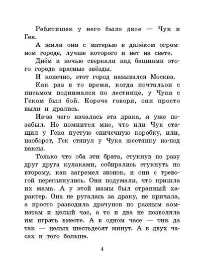 Maskavas zēnu Čuka un Geka tēvs strādā ģeoloģiskās izpētes bāzē nomaļā taigā. Viņš nevar atvaļinājumā aizbraukt prom no dēliem, tāpēc brāļi dodas viņu apciemot.