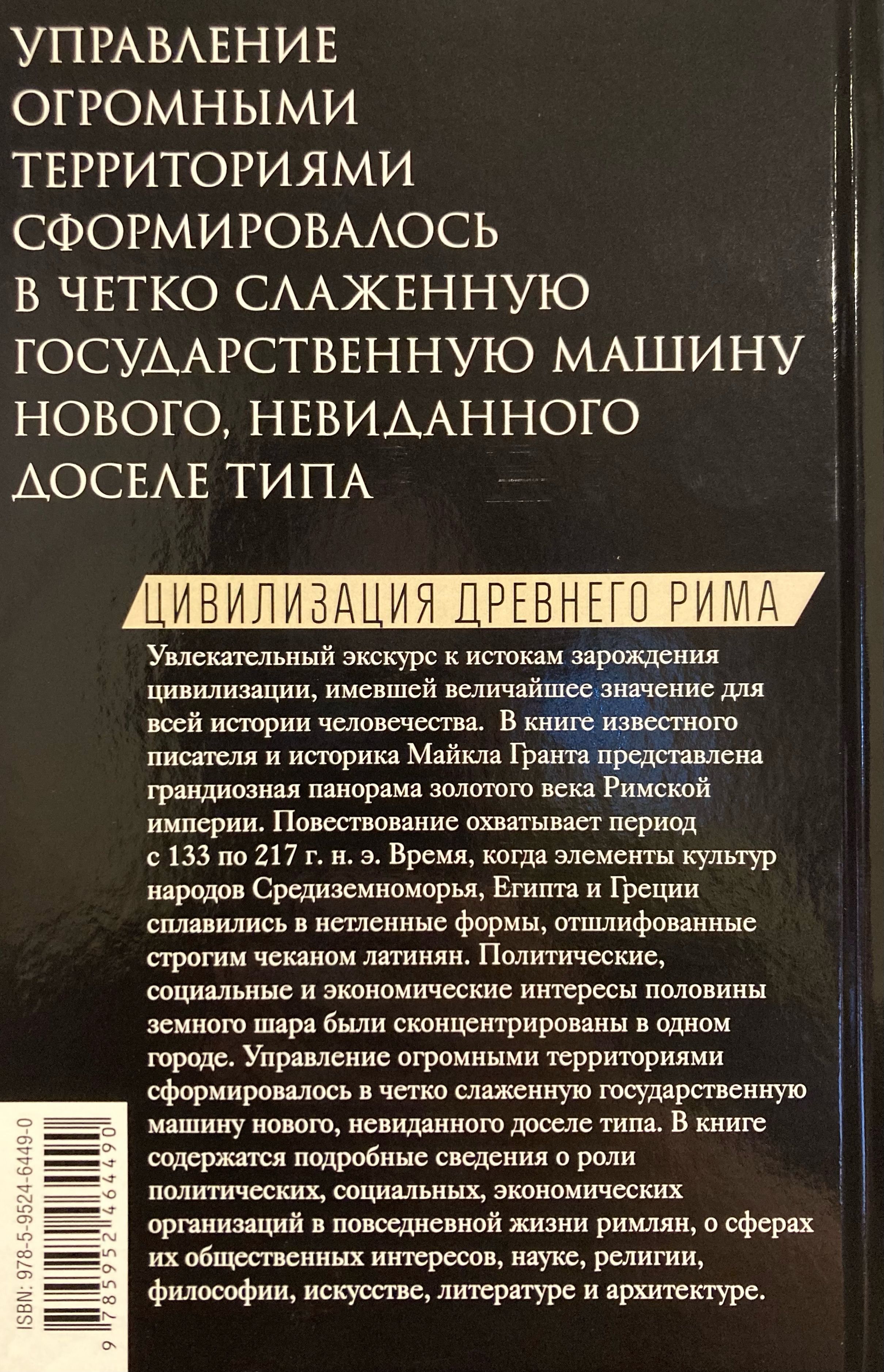 Slavenā rakstnieka un vēsturnieka Maikla Granta grāmata satur plašu informāciju par Romas valsts iekšējo uzbūvi un tās pilsoņu ikdienas dzīvi. Tiek pētīta to sabiedrisko interešu sfēra - zinātne, reliģija, filozofija, māksla, literatūra un arhitektūra. Tiek analizēta Romas civilizācijas fundamentālā ietekme uz turpmākajiem vēsturiskajiem veidojumiem.