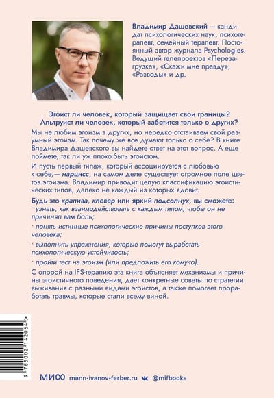 Balstoties uz IFS terapiju, šī grāmata izskaidro egoistiskas uzvedības mehānismus un cēloņus, sniedz konkrētus padomus par izdzīvošanas stratēģijām dažādiem egoistu tipiem un palīdz apstrādāt traumas, kas to izraisīja.