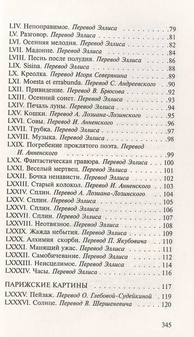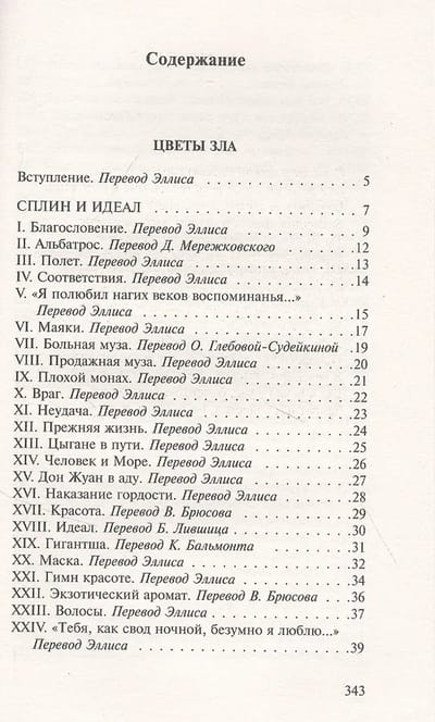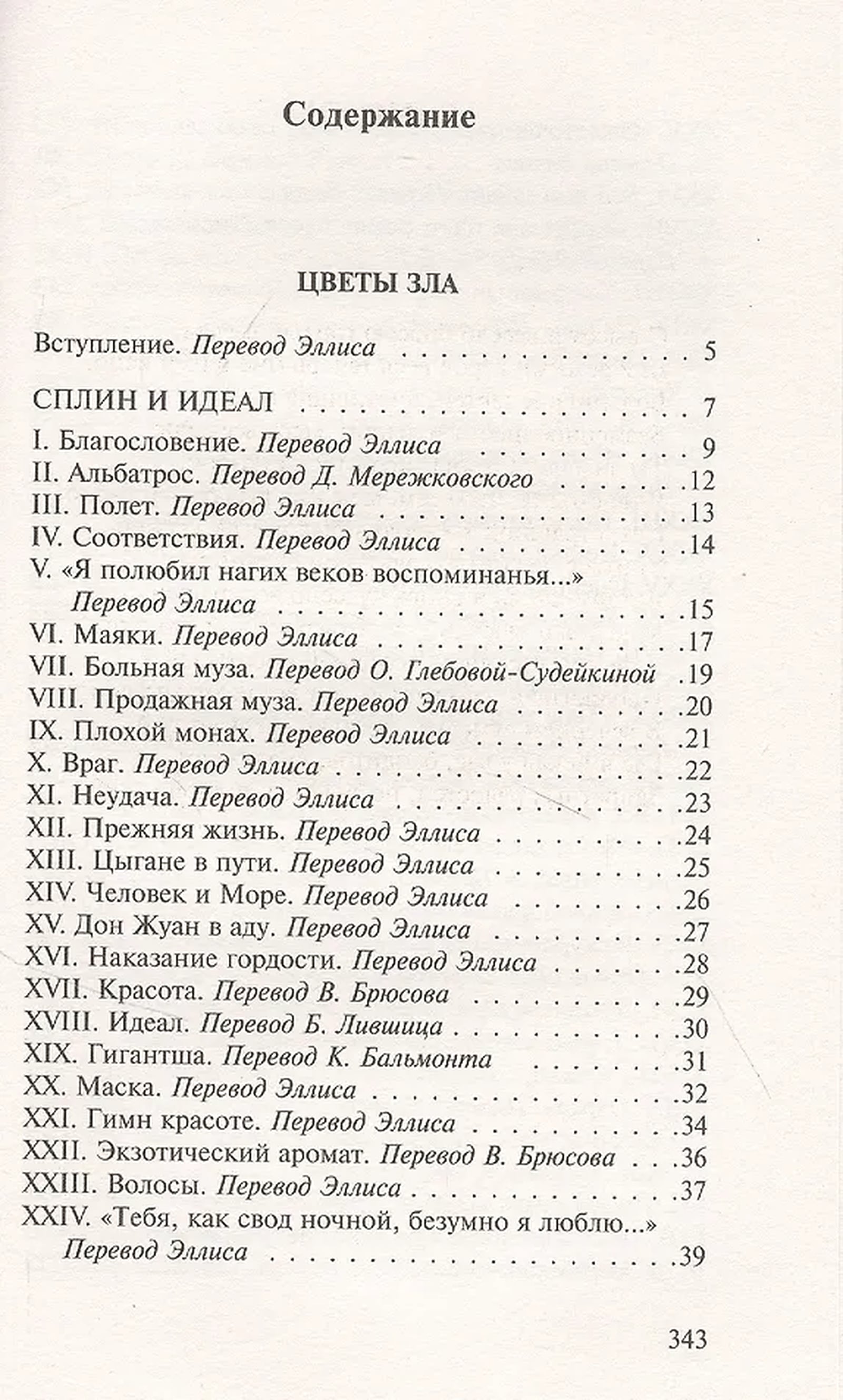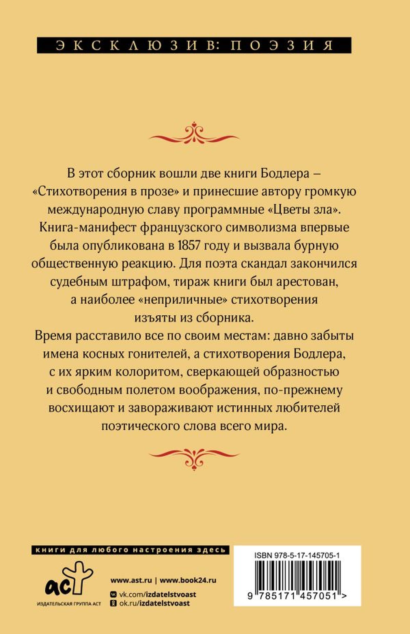 Šajā krājumā iekļautas divas Bodlēra grāmatas — "Dzejoļi prozā" un fundamentālā "Ļaunuma ziedi", kas autoram atnesa ievērojamu starptautisku slavu. Šī grāmata, franču simbolisma manifests, pirmo reizi tika publicēta 1857. gadā un izraisīja vētrainu sabiedrības reakciju. Skandāls beidzās ar tiesas sodu dzejniekam, grāmatas tirāža tika konfiscēta, un vis"nepieklājīgākie" dzejoļi tika izņemti no krājuma.