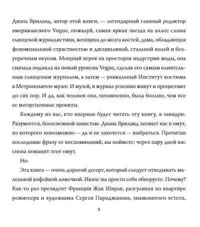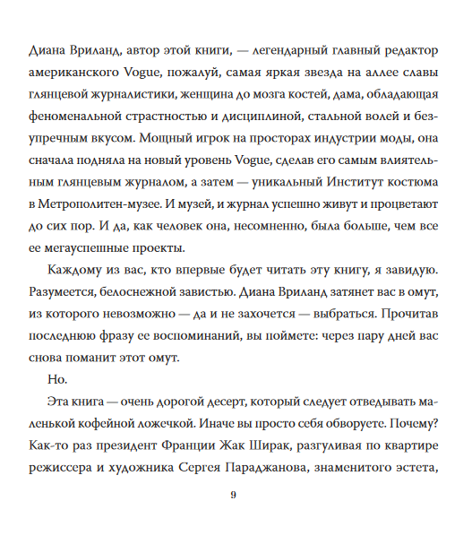 Šī grāmata ir hipnotizējoša autobiogrāfija par vienu no 20. gadsimta lielākajām modes ikonām - Diānu Vrīlandi, Harpers Bazaar modes redaktori un Vogue galveno redaktori, kuras nesalīdzināmā stila izjūta un talants piecdesmit gadus noteica augstās modes pasauli. Diāna Vrīlenda ir spilgta, izteiksmīga un harizmātiska stāstniece, kas mūs ieved savā žilbinošajā un vētrainajā dzīvē un atklāj mūsu iztēlei laikmeta greznību un spilgtumu, kas radīja Anglijas karalieni Mariju, Bufalo Billu, Sergeju Djagiļevu, Klārku Geiblu un Koko Šaneli.