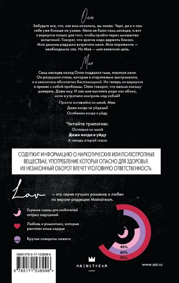 Pirms septiņiem mēnešiem Ollijs padevās tumsai un mani pameta. Viņš nojauca sienas, ko biju rūpīgi uzcēlusi, atstājot mani bezpalīdzīgu. Bet tagad viņš ir atpakaļ, un viņš ir atnesis sev līdzi problēmas. Ollijs saka, ka nevienam nevar uzticēties. Pat ne viņam. Un kā es varu aizstāvēt mūs abus, kad esmu zaudējusi kontroli?