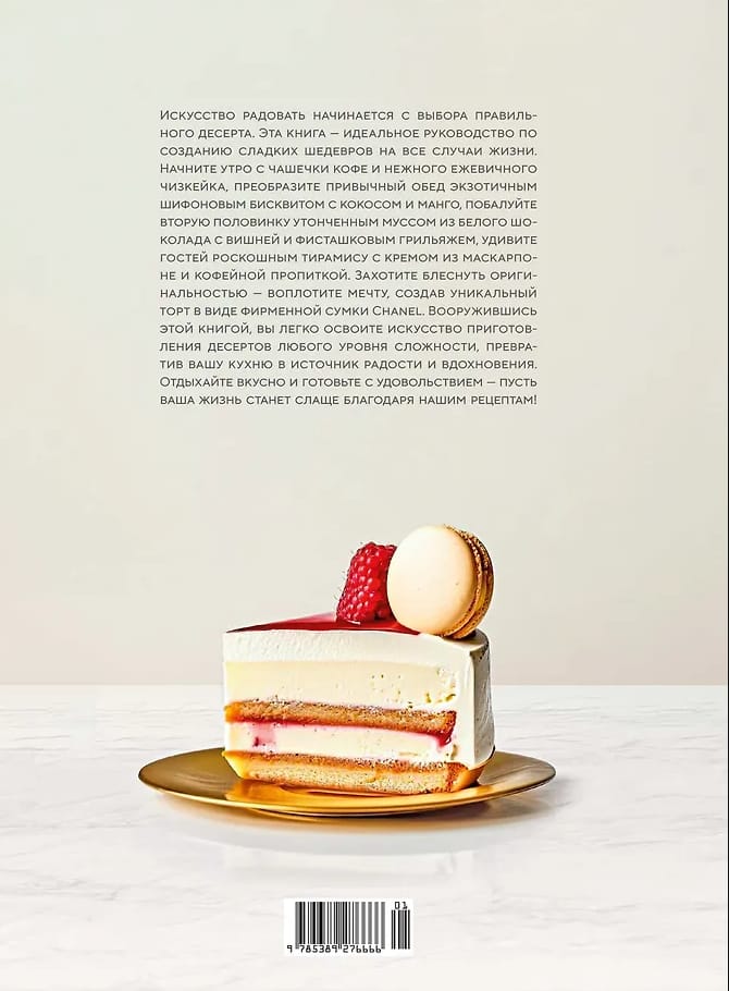 Atklājiet slavenā tiramisu ar maskarpones krēmu un kafijas mērci pagatavošanas noslēpumus, ieprieciniet savus mīļotos ar šokolādes krēma profiteroliem tējai, nogaršojiet eksotisku safrāna biskvītu ar kokosriekstu un mango, pārsteidziet savus viesus ar unikālu kūku, kas veidota kā firmas Chanel soma, un palutiniet savu partneri ar izsmalcinātu baltās šokolādes musu ar ķiršiem un pistāciju kraukšķiem. Sākot ar vienkāršas mīklas pagatavošanu un beidzot ar svētku kūku dekorēšanu, bruņojoties ar šo grāmatu, jūs apgūsiet visus konditorejas mākslas aspektus un izbaudīsiet baudījumu katrā kumosā!