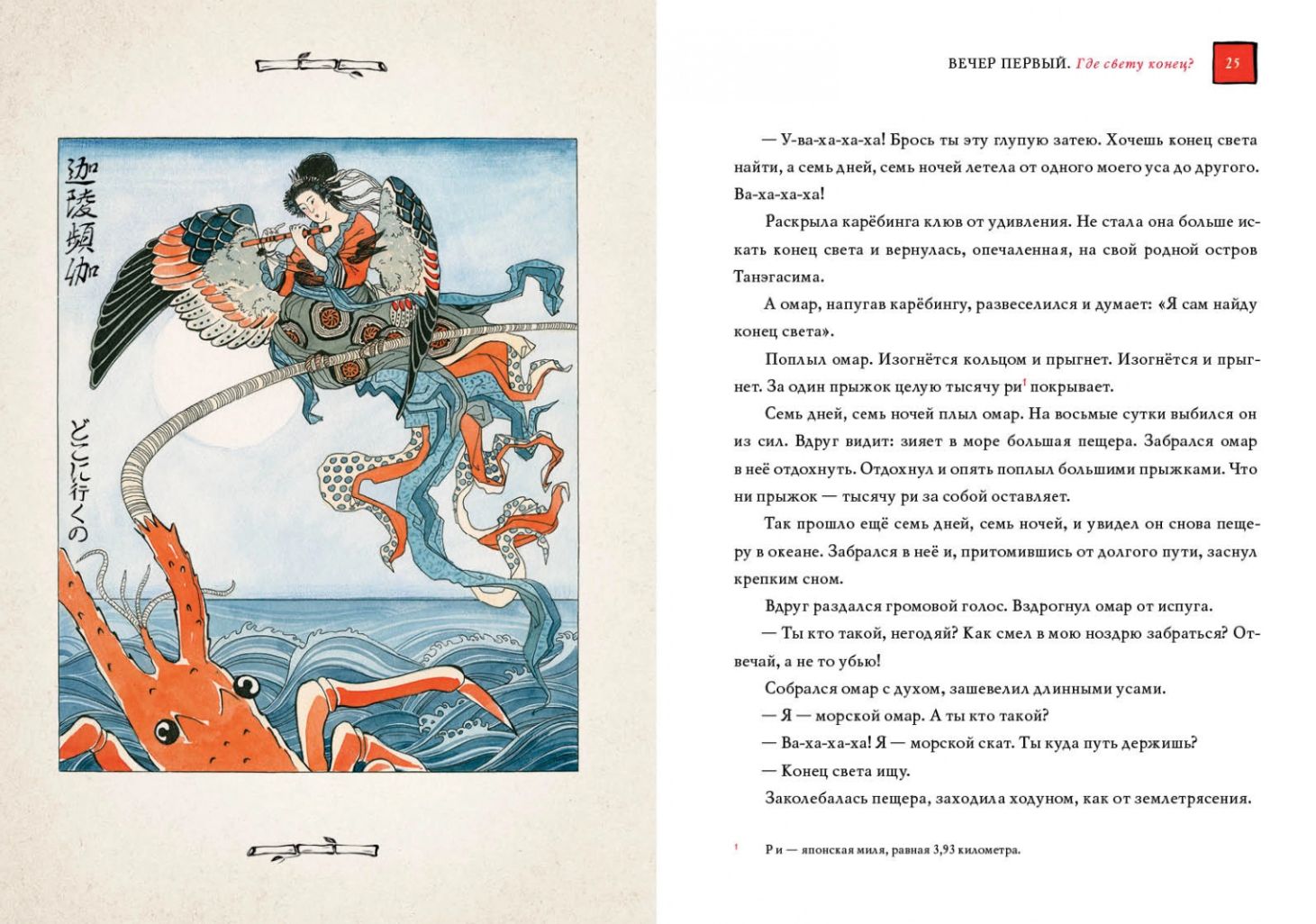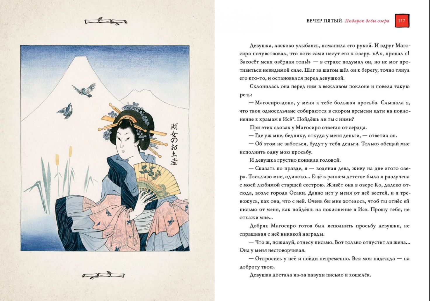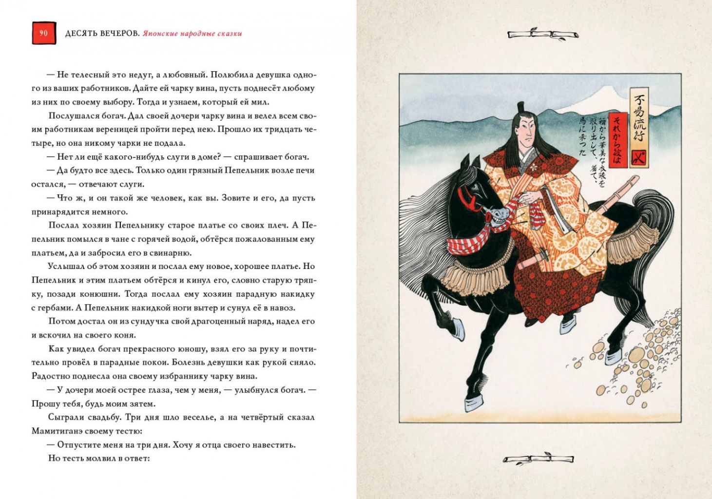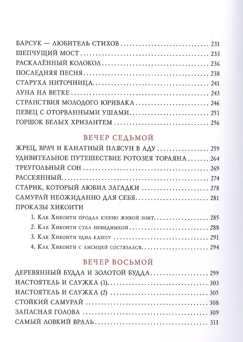 Japāņu pasakas raksturo oriģinalitāte un smalka skaistuma izjūta. Sižeta oriģinalitāte, tēlu poētiskums un smalkums ļauj lasītājam padziļināti izprast Uzlecošās saules zemes seno kultūru un paražas, kā arī atspoguļo japāņu neviltoto mīlestību pret dabu. Ķiršu ziedi, sarkanās kļavu lapas un pirmais sniegs ir ne tikai stāstījuma fons, bet gandrīz patstāvīgi tēli. Jūsu priekšā ir plašs japāņu pasaku krājums, kurā iekļautas burvju pasakas, pasakas par dzīvniekiem, pasakas-pabāžas, smieklīgas pasakas, kuru galvenie varoņi ir ķekatnieki un viltnieki, un daudzi citi brīnišķīgi stāsti. Vakars pēc vakara mazie lasītāji iepazīsies ar japāņu folkloras varoņiem: viltīgajiem meža tengu un ūdens kappām, skaistajām meitenēm putniem un sievietēm-čūskām, lapsām vilkačiem un jokdariņiem āpšiem, jautrajiem un jokainajiem Hikoiči. Pasaku varoņi atdzīvojas burvīgās mākslinieces Annas Khoptas ilustrācijās.