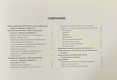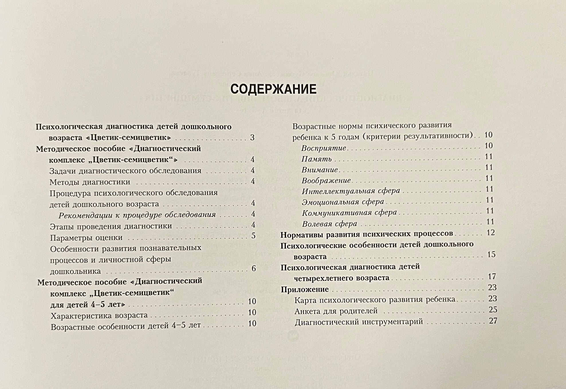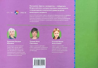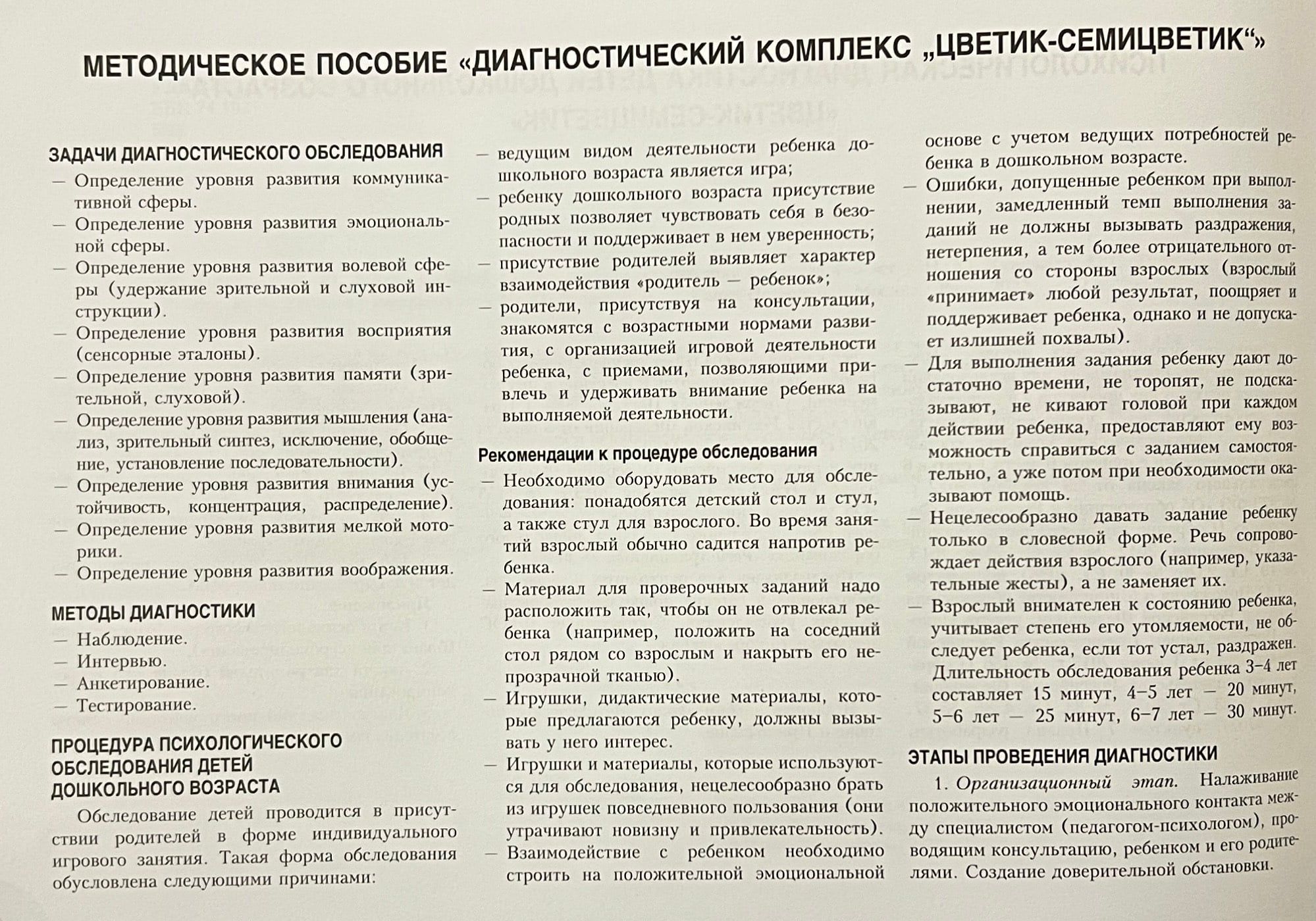 Diagnostikas albums "Ziedu septiņu ziedu" ir diagnostikas paņēmienu kopums, kas paredzēts pirmsskolas vecuma bērnu garīgo procesu attīstības un individuālo īpašību pētīšanai. Albumā detalizēti aprakstīta psiholoģiskās diagnozes procedūra, aplūkotas pirmsskolas vecuma bērnu psiholoģiskās īpašības, kā arī pirmsskolas vecuma bērnu garīgās attīstības normas: uztvere, atmiņa, uzmanība, iztēle, intelekts un psihofizioloģiskā sfēra. Metodoloģiskajiem ieteikumiem ir pievienots volumetriskās diagnostikas instrumentu komplekts.