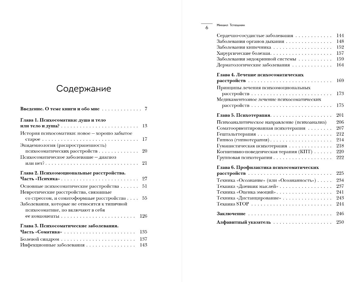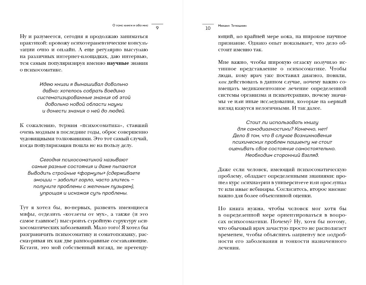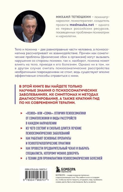 Psihiatra-narkologa, psihoterapeita, projekta mednauka.net veidotāja Mihaila Tetjuškina grāmata. Ar tās palīdzību jūs sapratīsiet, kas ir psihosomatika un kas to var izraisīt, kādi ir tās simptomi un kāda pieeja tās ārstēšanai tiek izmantota mūsdienās. Autore visus traucējumus iedala divās grupās – psihosomatiskajos un somatopsihiskajos – un skaidro katra virziena īpatnības.