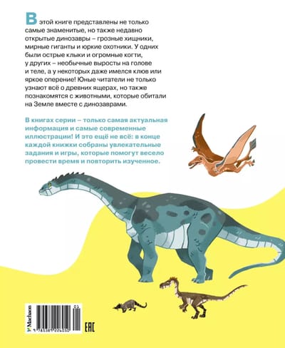 Šajā grāmatā ir ne tikai slavenākie dinozauri, bet arī nesen atklātie – briesmīgi plēsēji, miermīlīgi milži un veikli mednieki. Dažiem bija asi ilkņi un milzīgi nagi, citiem uz galvas un ķermeņa bija neparasti izaugumi, bet dažiem pat bija knābji vai spilgtas spalvas! Jaunie lasītāji ne tikai uzzinās visu par senajām ķirzakām, bet arī iepazīs dzīvniekus, kas dzīvoja uz Zemes kopā ar dinozauriem. Sērijas grāmatās ir tikai visjaunākā informācija un vismodernākās ilustrācijas! Un tas vēl nav viss: katras grāmatas beigās ir aizraujoši uzdevumi un spēles, kas palīdzēs izklaidēties un pārskatīt apgūto.