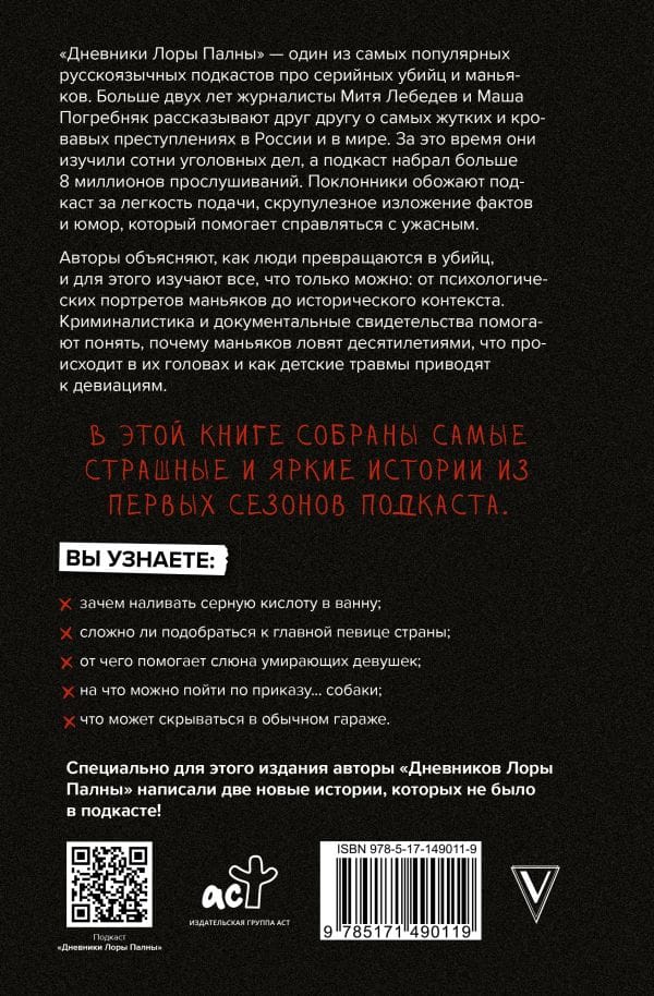 "Lauras Palnas dienasgrāmatas" - viens no populārākajiem podkāstiem krievu valodā par sērijveida slepkavām un maniakiem. Jau vairāk nekā divus gadus žurnālisti Mitja Ļebedevs un Maša Pogrebņjaka stāsta viens otram par šausminošākajiem un asiņainākajiem noziegumiem Krievijā un visā pasaulē. Šajā laikā viņi ir izpētījuši simtiem krimināllietu, un podkāstu ir noklausījušies vairāk nekā 8 miljoni klausītāju. Fani mīl podkāstu par tā vieglumu, skrupulozo faktu izklāstu un humoru, kas palīdz tikt galā ar šausmīgo. Autori skaidro, kā cilvēki kļūst par slepkavām, un, lai to izdarītu, viņi pēta visu, sākot no maniaku psiholoģiskajiem portretiem līdz vēsturiskajam kontekstam. Tiesu ekspertīze un dokumentālie pierādījumi palīdz saprast, kāpēc maniaki ir notverti gadu desmitiem, kas notiek viņu galvās un kā bērnības traumas noved pie deviācijas.
