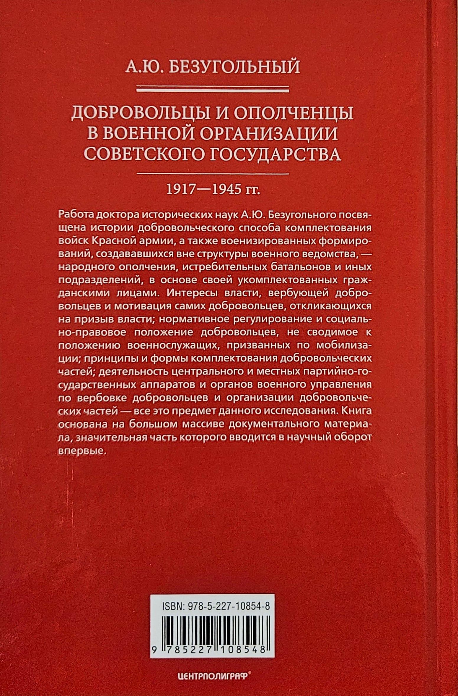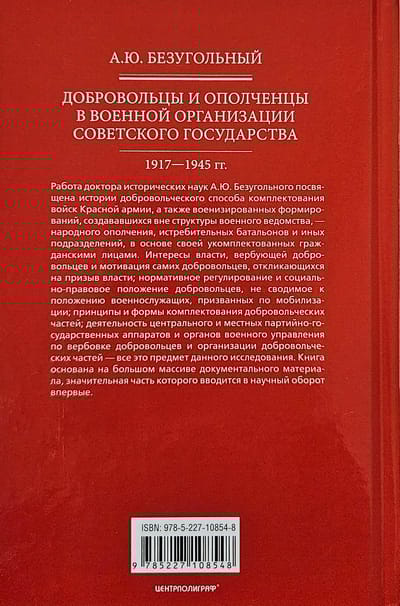Vēsturisko zinātņu doktora A. J. Bezgolnija darbs ir veltīts Sarkanās armijas karaspēka komplektēšanas brīvprātīgās metodes vēsturei, kā arī paramilitārajiem formējumiem, kas tika izveidoti ārpus militārā departamenta struktūras - tautas milicijas, cīnītāju bataljoniem un citām vienībām, galvenokārt ar civiliedzīvotāju personālu. Šī pētījuma priekšmets ir to iestāžu intereses, kuras pieņem darbā brīvprātīgos, un pašu brīvprātīgo motivācija, kas atbild uz varas iestāžu aicinājumu; normatīvais regulējums un brīvprātīgo sociālais un juridiskais statuss; brīvprātīgo vienību darbā pieņemšanas principi un veidi; centrālo un vietējo partiju un valsts aparātu un militāro vadības struktūru darbība brīvprātīgo vervēšanai un brīvprātīgo vienību organizēšanai. Grāmatas pamatā ir liels dokumentālā materiāla klāsts, no kura ievērojama daļa pirmoreiz tiek ieviesta zinātniskajā apritē.
