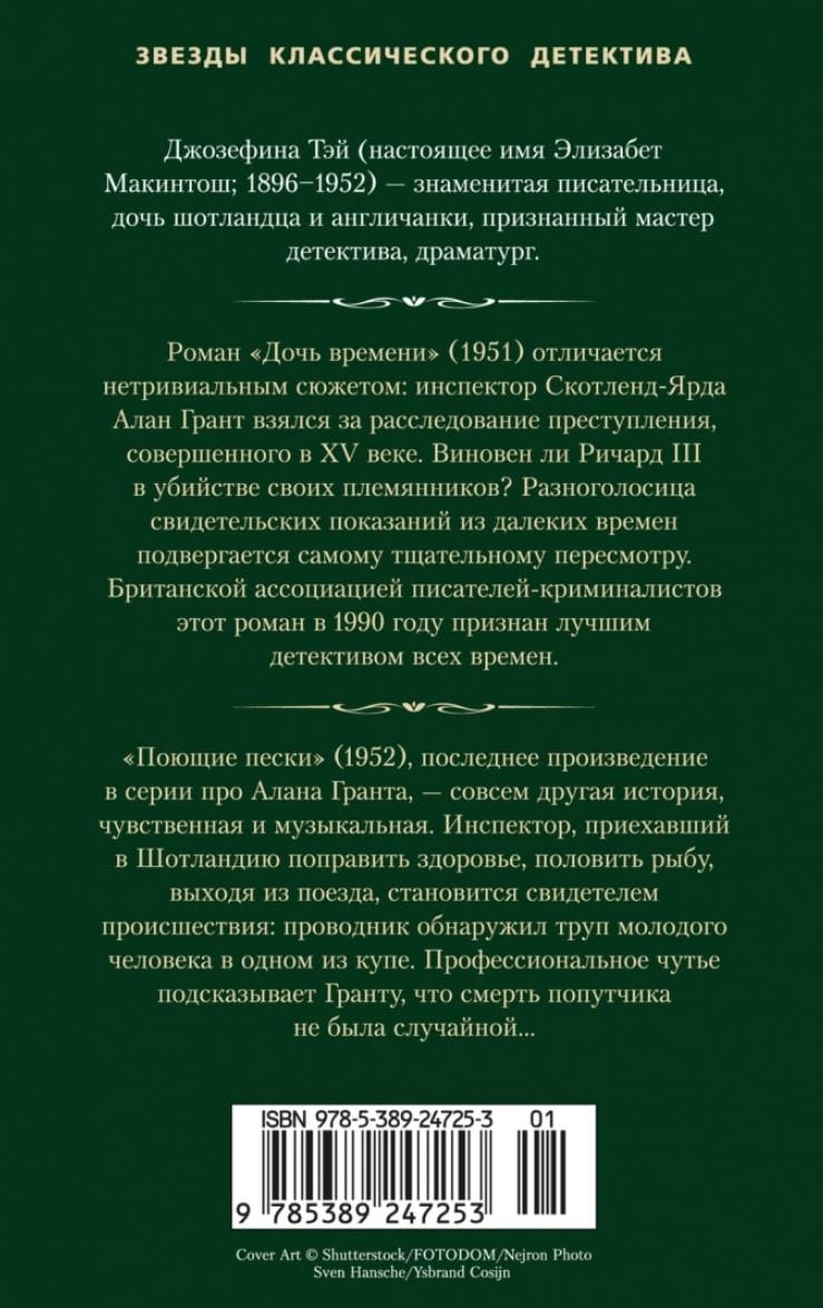Žozefīne Teja (īstajā vārdā Elizabete Makintoša; 1896-1952) bija slavena rakstniece, skota un anglietes meita, atzīta detektīva meistare un dramaturģe. Romāns "Laika meita" (1951) izceļas ar netriviālu sižetu: Skotlendjarda inspektors Alans Grants uzņēmās izmeklēt XV gadsimtā izdarītu noziegumu. Vai Ričards III ir vainīgs savu brāļadēlu slepkavībā? Visstingrākajai pārbaudei tiek pakļauta dažādu liecību virkne no tālākajiem laikiem. Britu kriminālromānu rakstnieku asociācija 1990. gadā atzina šo romānu par visu laiku labāko detektīvromānu. "Dziedošās smiltis" (1952), pēdējais Alana Granta sērijas darbs, ir pavisam atšķirīgs stāsts, juteklisks un muzikāls. Inspektors, kurš ieradies Skotijā uzlabot veselību, makšķerēt, izkāpjot no vilciena, kļūst par liecinieku negadījumam: konduktors vienā no kupejām atrod kāda jauna vīrieša līķi. Granta profesionālie instinkti viņam saka, ka līdzbraucēja nāve nav nejauša.