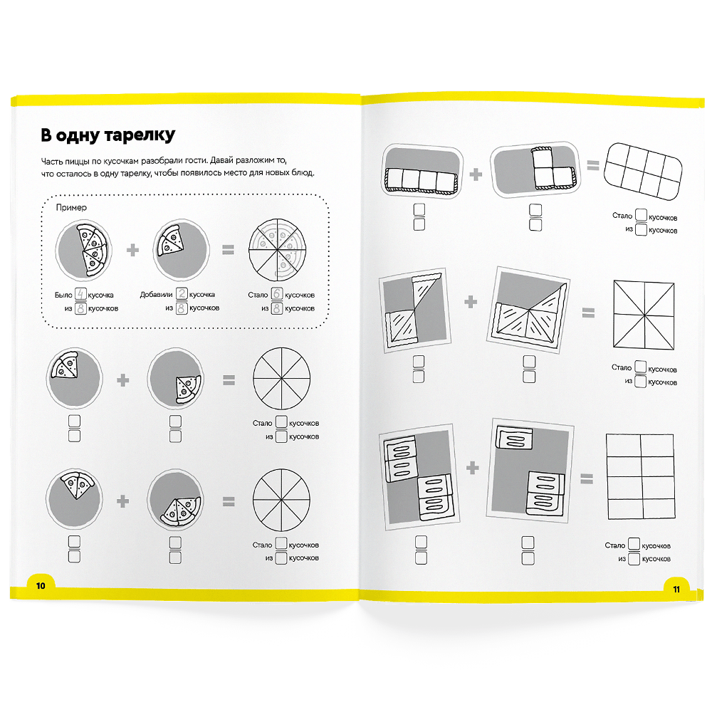 Jautri uzdevumi dabiskā veidā iepazīstina ar skaitlisko daļskaitļu apzīmējumu. Risinot piemērus ar vizuālu picas un pīrāgu šķēlīšu palīdzību, bērni vienmērīgi pāriet uz darbībām ar skaitliskajām daļām. Drumstalu un daļskaitļu izpratnes noslēpums ir pakāpeniska apgūšana. Nav jēgas skaidrot pat vienkāršas darbības ar daļskaitļiem, neizprotot, kā tās darbojas un kā 2/3 atšķiras no 3/2 vispār. Un ar picām un pīrāgiem piezīmju grāmatas lappusēs tas būs ne tikai viegli, bet arī tik garšīgi! Blociņi "Atrisini-uzraksti. Drumstalas un frakcijas" palīdzēs iepazīties ar frakcijām un daļskaitļiem un raiti pāriet pie reālu skaitlisko piemēru risināšanas. Otrajā 7-8 gadus veciem bērniem paredzētajā piezīmju grāmatiņā bērni dabiskā veidā tiek iepazīstināti ar skaitlisko daļiņu pierakstu. Blociņu efektivitātes noslēpums: - vienmērīga sarežģītība. Tā ir pakāpeniska daļskaitļu un dalāmo lielumu apguve - garantija, ka bērns ne tikai iemācīsies dalītājzīmes, bet arī sapratīs tās un spēs lietot. - vizuāls skaidrojums. Uzdevumi ir izstrādāti tā, lai, risinot tos vienu pēc otra, bērns patstāvīgi izprastu daļu jēdzienu un matemātisko darbību ar tām principus. - Aizraujoši uzdevumi ar stāstu. Ir daudz interesantāk saskaitīt, cik picas šķēļu nepieciešams, lai paēdinātu visus viesus, nekā risināt piemērus ar skaitļiem.