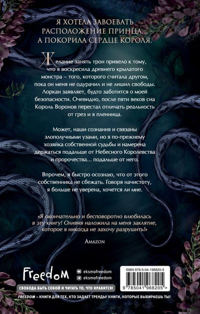 Es gribēju iekarot prinča labvēlību... bet es iekaroju karaļa sirdi. Mana vēlme pēc troņa lika man atdzīvināt senu spārnotu briesmoni - tādu, ko es uzskatīju par draugu, līdz viņš mani apmānīja un atņēma man brīvību. Lorkāns apgalvo, ka ir noraizējies par manu drošību. Acīmredzot pēc pieciem gadsimtiem miega Kraukļu karalis ir pārstājis atšķirt realitāti no sapņiem, un es esmu gūsteknis. Iespējams, mūsu prātus saista nelaimīgas saites, bet es joprojām esmu sava likteņa noteicēja, un es grasos turēties prom no Debesu valstības un pravietojuma... prom no viņa. Tomēr es ātri saprotu, ka no šīs valdonības nav iespējams izbēgt. Godīgi sakot, es vairs neesmu pārliecināts, vai es to gribu.