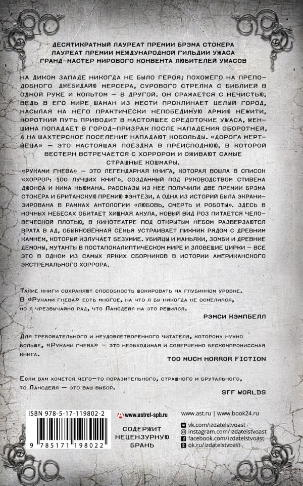 Savvaļas Rietumos nekad nav bijis tāda varoņa kā reverends Džebidajs Mersersers - nelokāms miesassargs ar Bībeli vienā rokā un koltu otrā. Viņš cīnās ar nemirstīgajiem, jo viņa pasaulē šamanis no atriebības nolād visu pilsētu, radot gandrīz neuzvaramu nemirstīgo armiju, kāda sieviete pēc vilkača uzbrukuma ir iesprostota spoku pilsētā, bet kalnraču apmetnei uzbrūk koboldi. "Nāves ceļš" ir īsts ceļojums uz pagrīdes pasauli, kur vesterni satiekas ar šausmu filmām un atdzīvojas ļaunākie murgi. "Ar dusmu rokām" ir leģendāra grāmata, kas Stīvena Džonsa un Kima Ņūmena vadībā iekļuva "Šausmu: 100 labāko grāmatu" sarakstā. Šeit nakts debesīs dzīvo plēsīga haizivs, jauna izsmalcinātu rožu šķirne barojas ar cilvēka miesu, un parasta ģimene piknikā dodas pie sena akmens, kas izstaro neprātu. Slepkavas un maniaki, zombiji un seni dēmoni - visi tie ir iekļauti vienā no kolorītākajiem krājumiem amerikāņu ekstrēmo šausmu grāmatu vēsturē.